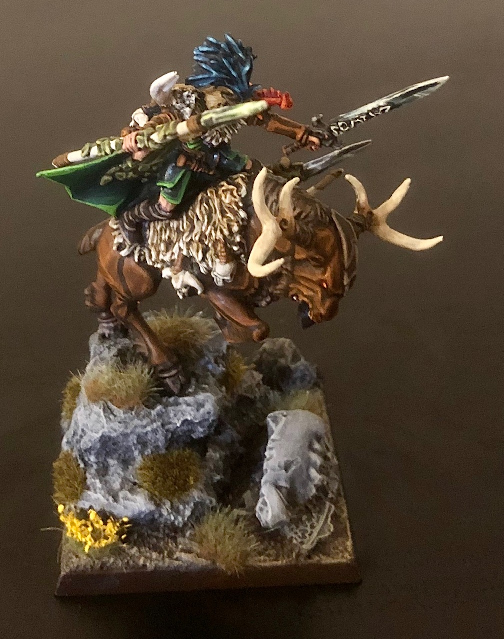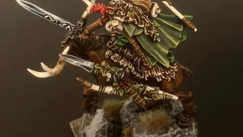 Danke, dann habe ich direkt wieder was neues aus der Malwerkstatt. Diesmal habe ich mich an den Elf Lord auf dem Riesenhirsch gewagt. Bei diesem Modell habe ich erstmals auf Metallicfarben verzichtet und stattdessen verschiedene Varianten des NMM (Non Metallic Metal) ausprobiert, gut auf dem zweiten Bild zu erkennen: