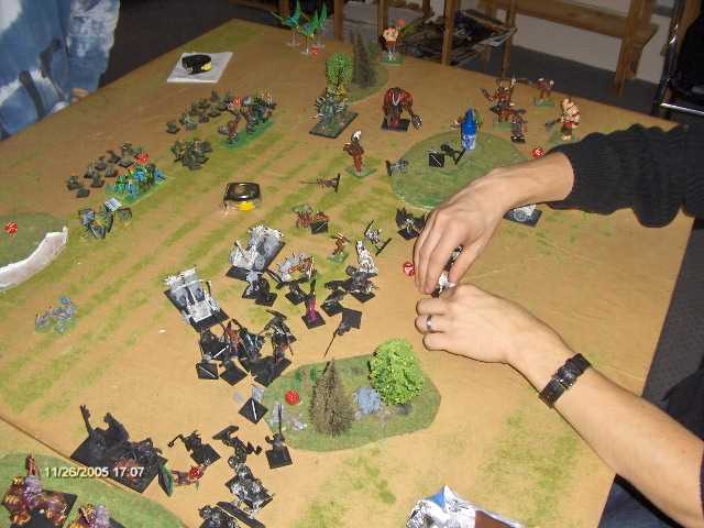 wer morghul nicht kennt der hat so manche böse oder lustige sonderregel . alles was in 12 " umkreis zu beginn seiner phase ist muss einen Mw test machen (chaoshunde also 5 ) sollten diese einheiten den test nicht schaffen bekommt die einheit w6 treffer der s4 und aus disen schaden entsteht dann eine Chaosbrut mit soviel leben wie die einheit verloren hat , da könnt ihr euch betimmt vorstellen wie schnell da 10-20 chaosbruten auf einen zukommen . morghul ist auch gegen beschuss sehr gut geschützt ,da alles was auf ihm schiesst und weiter als 12 " weg ist ,sich der beschuss in blumen und kröten verwandelt und ihm so nicht schaden kann . war heute in meinen augen die komischte armee wo ich gesehen habe . irgendwie fühlte ich mich heute von echsen eingezingelt , sind egal mit welchen volk immer meine angstgegner im 2ten spiel muss ich gegen unseren Floh antreten , was mich einerseits sehr freute , da ich noch nie gegen ihn gespielt habe . also vor mir floh mit slann und echsen , direkt links neben mir von den 3er spielttisch ( wurde für 3 schlachten unter teilt ) , schaue ich hin und dort steht ein slann hilfe ,naja nicht so schlimm dachte ich schaue ich nach rechts was da neben mir spielt , was wird dort gerade aufgestellt ein slann ! so etwas nenne ich psychologische Kriegsführung , ob man das glaubt oder nicht ,als ich das sah wurde ich mehr als nervös. was auch sehr erfreulich war , die einzigen wo meiner armee gefährlich wurden auf den letzten 2 turnieren waren echt unsere Boardmembers ! A-men mit seinen Ogern , einfach da sie böse im nahkampf sind und er spielerisch sehr gut spielt und heute Floh der mit seiner slann-beschussliste mich im nahkampf zerlegte.völker wo heute vertreten waren auf diesen unbeschränkten wo ich nocht weiss