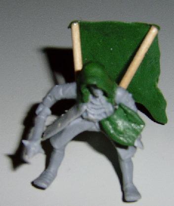 im Anschluss habe ich etwas Greenstuff ausgerollt um zum einen den Banner auf dem Rücken zu schneiden und zum anderen die Schrifftrolle zu formen, bei der Schriftrolle dann einfach ein Rechteckiges Stück zurechtschneiden und die Enden oben und unten ein klleine Stück umknicken, das ganze dan aushärten lassen, feritig ist die Schriftrolle