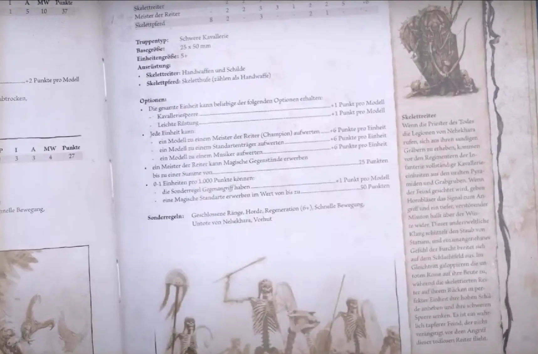 -Nekropolenritter: Runter auf 4+ Rüstung, aber dafür halt die Regeneration und Rüstung ist in ToW stärker als in der 8. Edition. Sie können jetzt ein magisches Banner nehmen und der Champion kann eine Zweihandwaffe und Magische Gegenstände bekommen. Ich glaube die werden auch ein großer Gewinner, weil sie weit chargen können und einen enormen Damageoutput haben. Sie haben sogar einen Aufpralltreffer pro Modell bekommen! Dadurch werden wenige Gegner überhaupt zurückschlagen können.