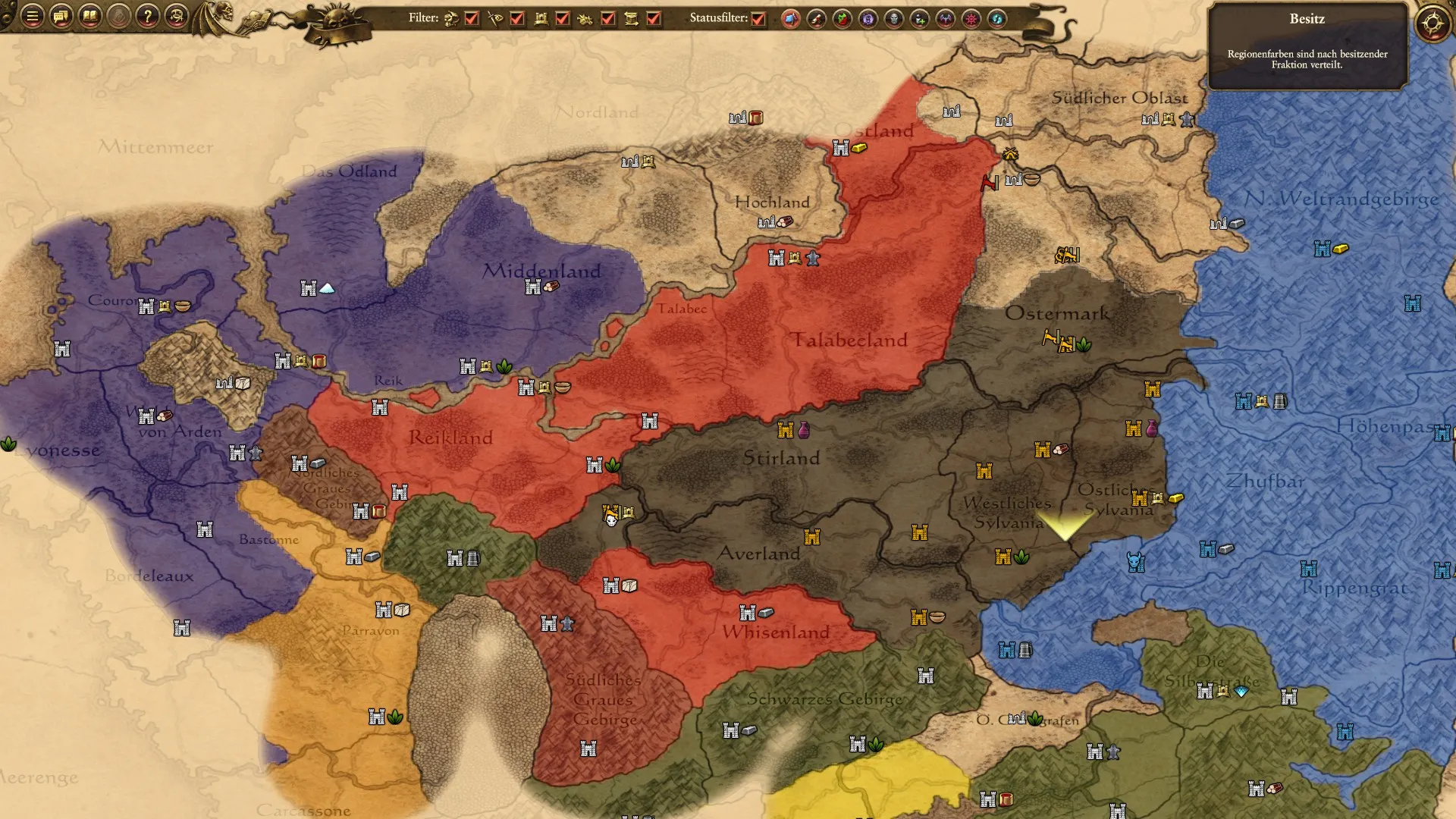 Im Norden des Reichs der Vampirfürsten (schwarz) befindet sich das verheerte Kislev - reif zur Eroberung. Im Osten hausen die verbündeten Zwerge (blau). Den Orks (grün) im Süden ist nicht zu trauen. Das Imperium im Westen (rot) könnte noch eine echte Bedrohung werden***.