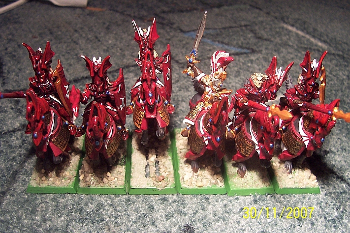 Also meine Hochelfen sind auch in tiefstem rot gehalten. Ich hatte auch in der Hochelfengalerie irgendwo bei Seite 20 rum mal was gepostet. Ich hänge hier nochmal ein Bild in den Anhang. Das ist ein Drachenprinz dessen Rüstung ich nur mit rot-Tönen gemalt habe. Die tiefsten Schichten sind eine Mischung aus Khorne Red und Rhinox Hide. Darüber ist großflächig alles mit Wazdakka Red geschichtet. Anschließend habe ich alles mit schwarzem Ink getuscht und dannach mit Evil Sunz Scarlet Akzente gesetzt. Abschließend habe ich die Komplette Rüstung mit eine Schicht Glanzlack übergepinselt (in meinem Fall Haarlack) um einen Glänzenden Effekt zu erzielen.