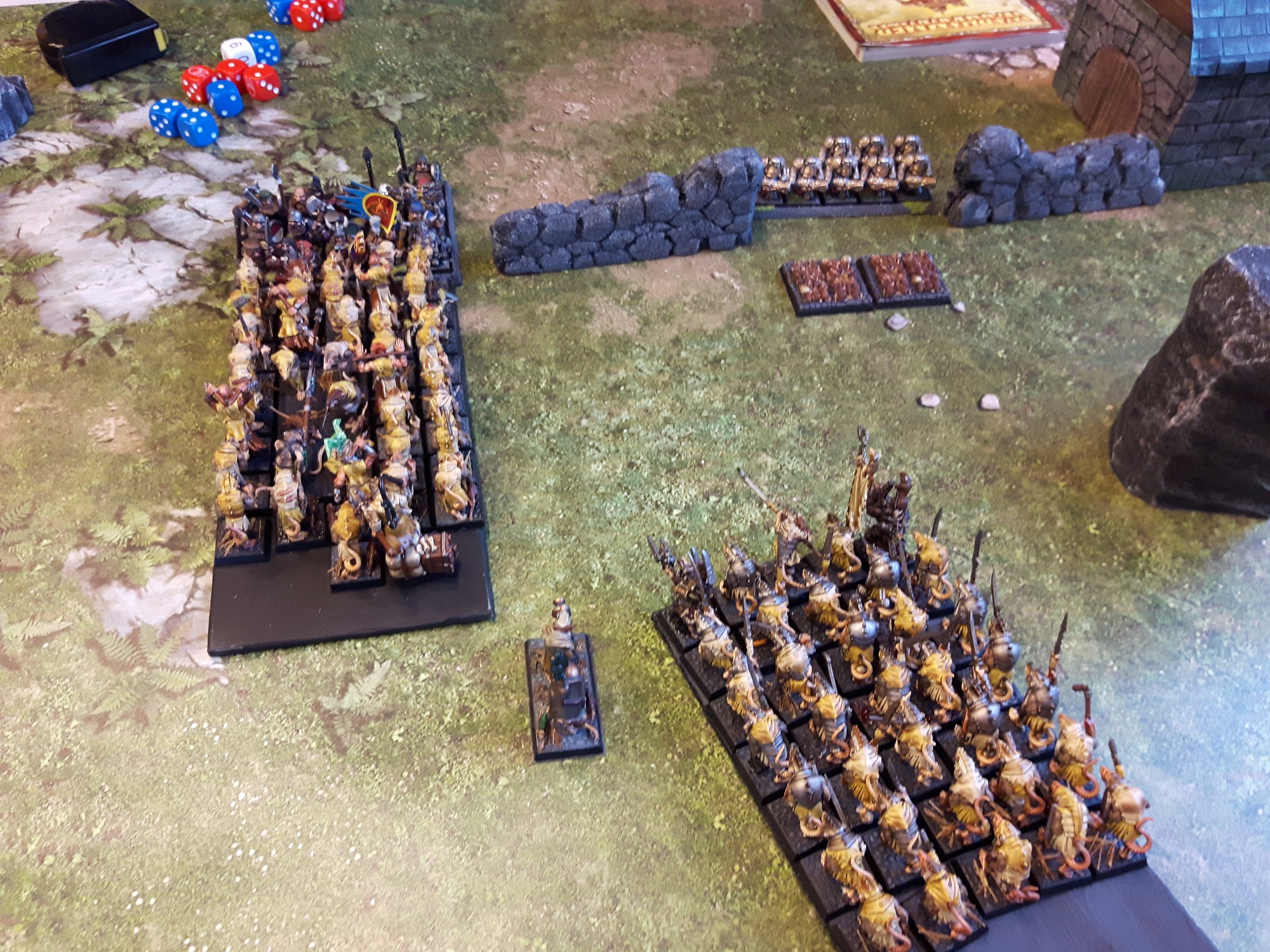 Skaven beginnen und bewegen sich voran. Magie (Warpblitz) ergibt eine Rückkopplung auf Kilowatt, welchen er jedoch unbeschadet überlebt. Ein Versengenzauber kostet einen Eisendrachen das Leben.