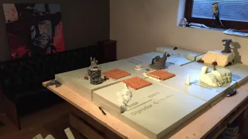 Entstanden ist alles aus Styrodur und vereinzelt wurden Rinden-Stücke platziert um Felsen darzustellen. Auf den Bildern sind die Platten noch am Trocknen. Als nächstes soll mit Spachtelmasse das ganze noch verbunden werden, sodass die "Felsen" und Hügel mehr mit dem "Flachland" verschmelzen und alles ein natürliches Aussehen bekommt. Danach dann das übliche Besanden und Begrasen.