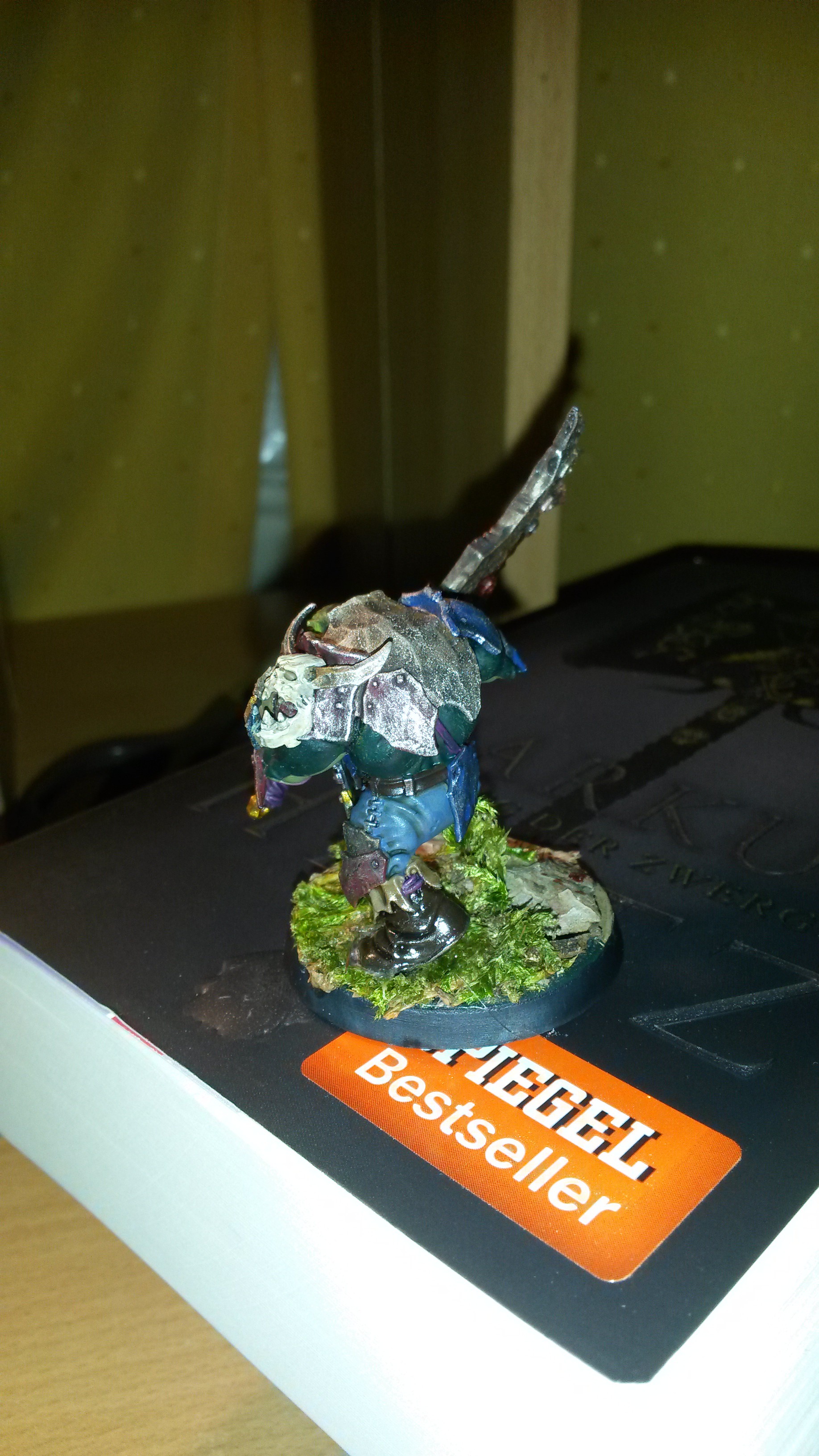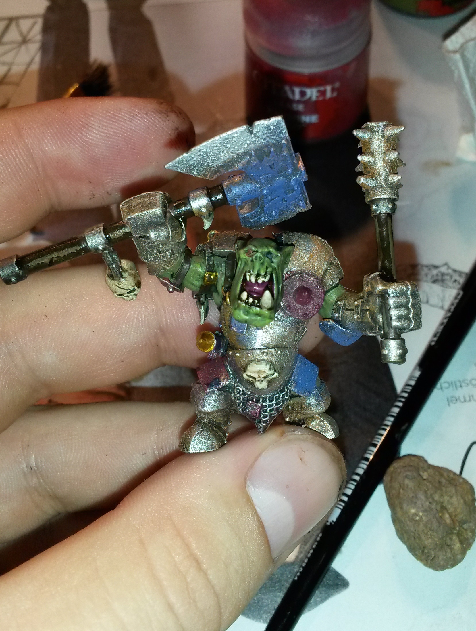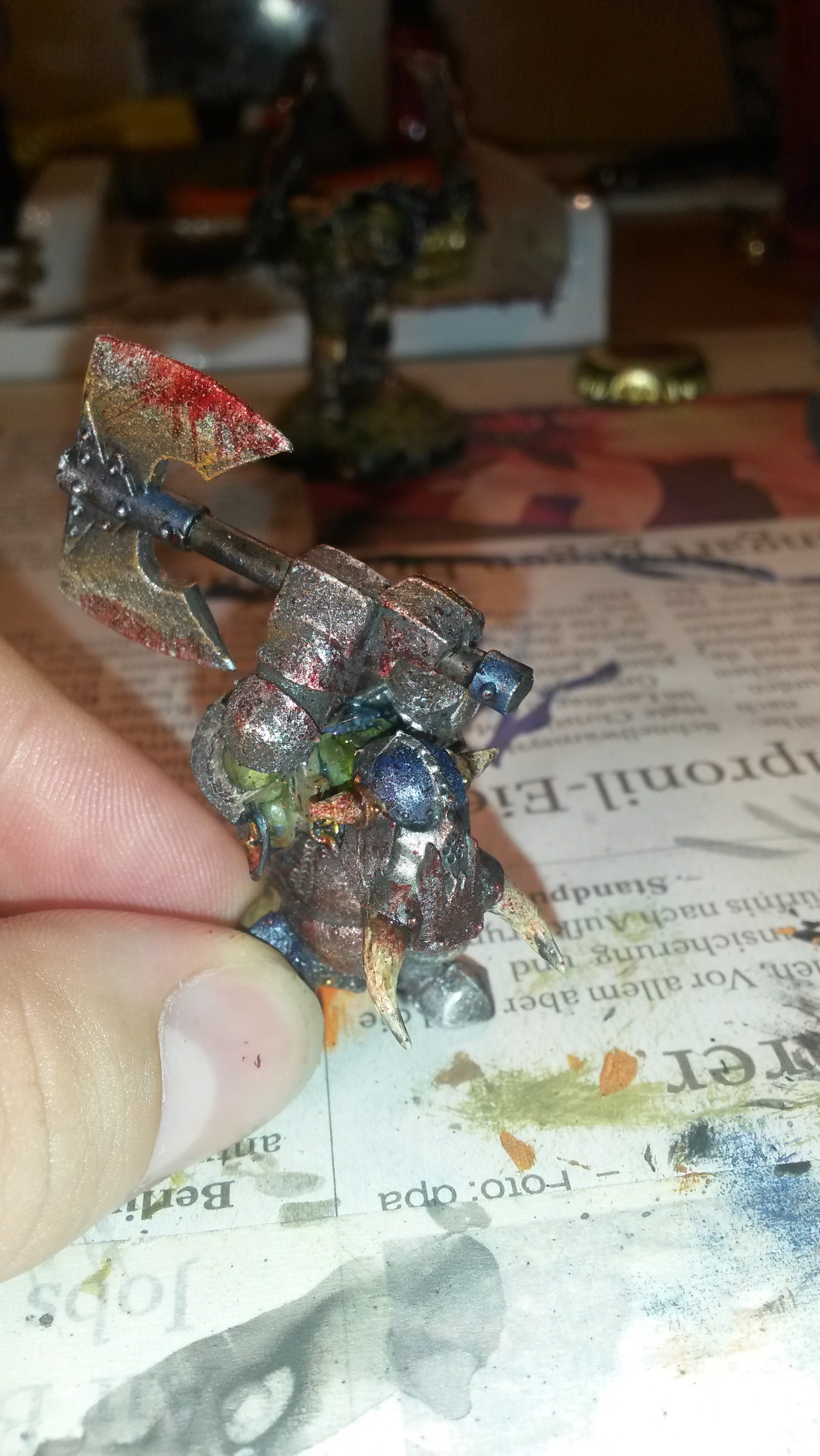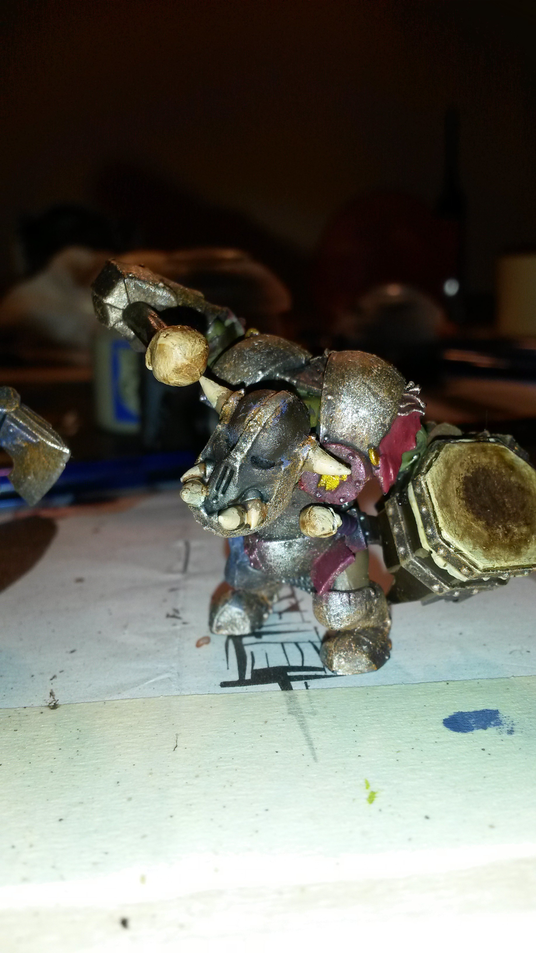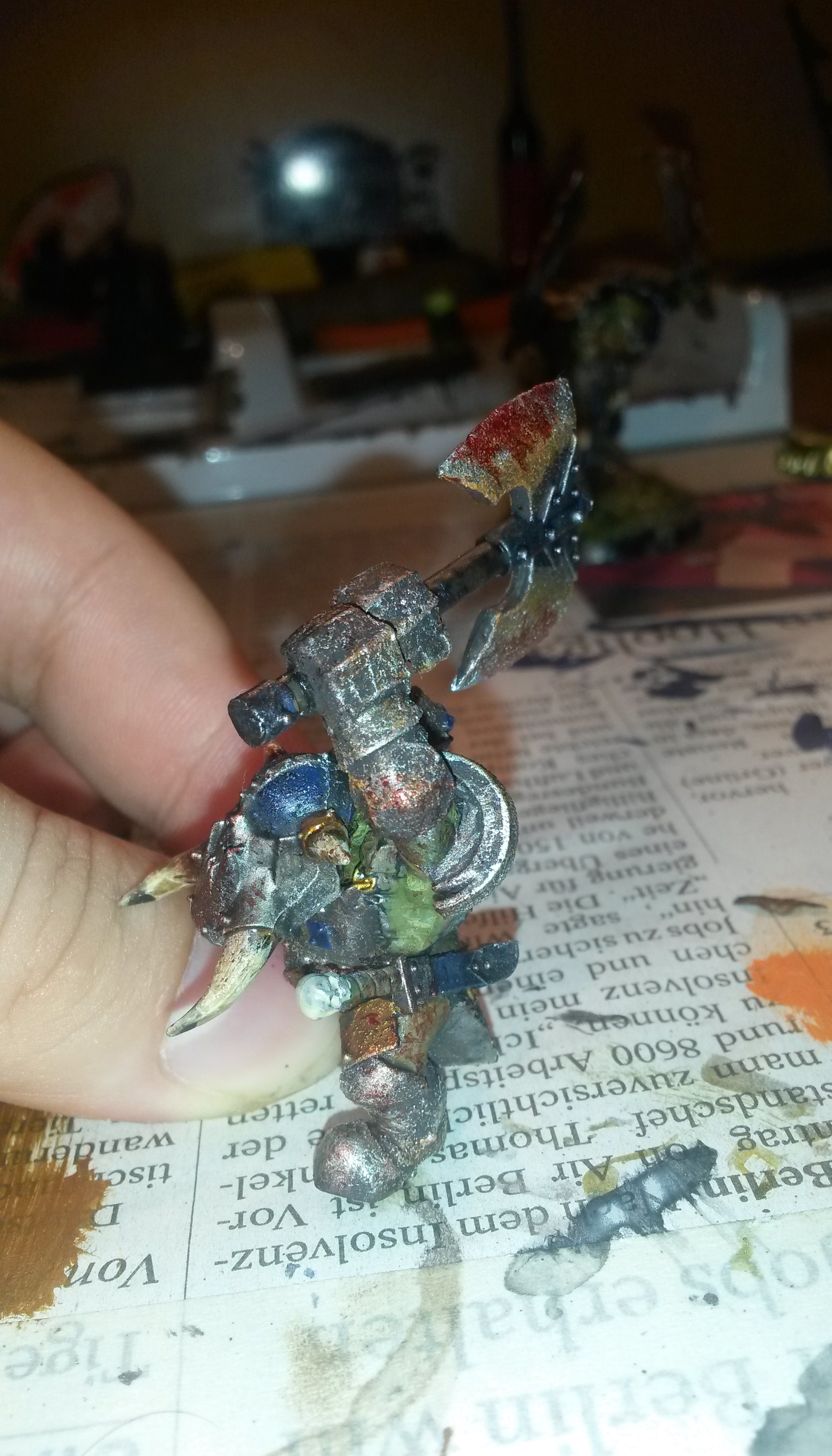 Bis jetzt hab ich nur mein Farbschema an einen Brute getestet. Habe mir für dieses Monat erstmal die Haut und Grundrüstung vorgenommen, deswegen sind noch paar Teile nicht bemalt ( Zähne, Hörner, Holz, Leder). Diese werden aber noch folgen. Ich hab den Burschen nicht komplett zusammen gebaut, damit ich die Teile besser anmalen kann. Für den Brute gefällt mir das Ergebnis schon mal sehr gut. Für heute steht noch der Zusammenbau eines Ardboys auf den Plan und wie sich das Schema auf den Kerl anwenden lässt. Naja, hier mal ein paar Bilder zu den bereits gemalten Brute: