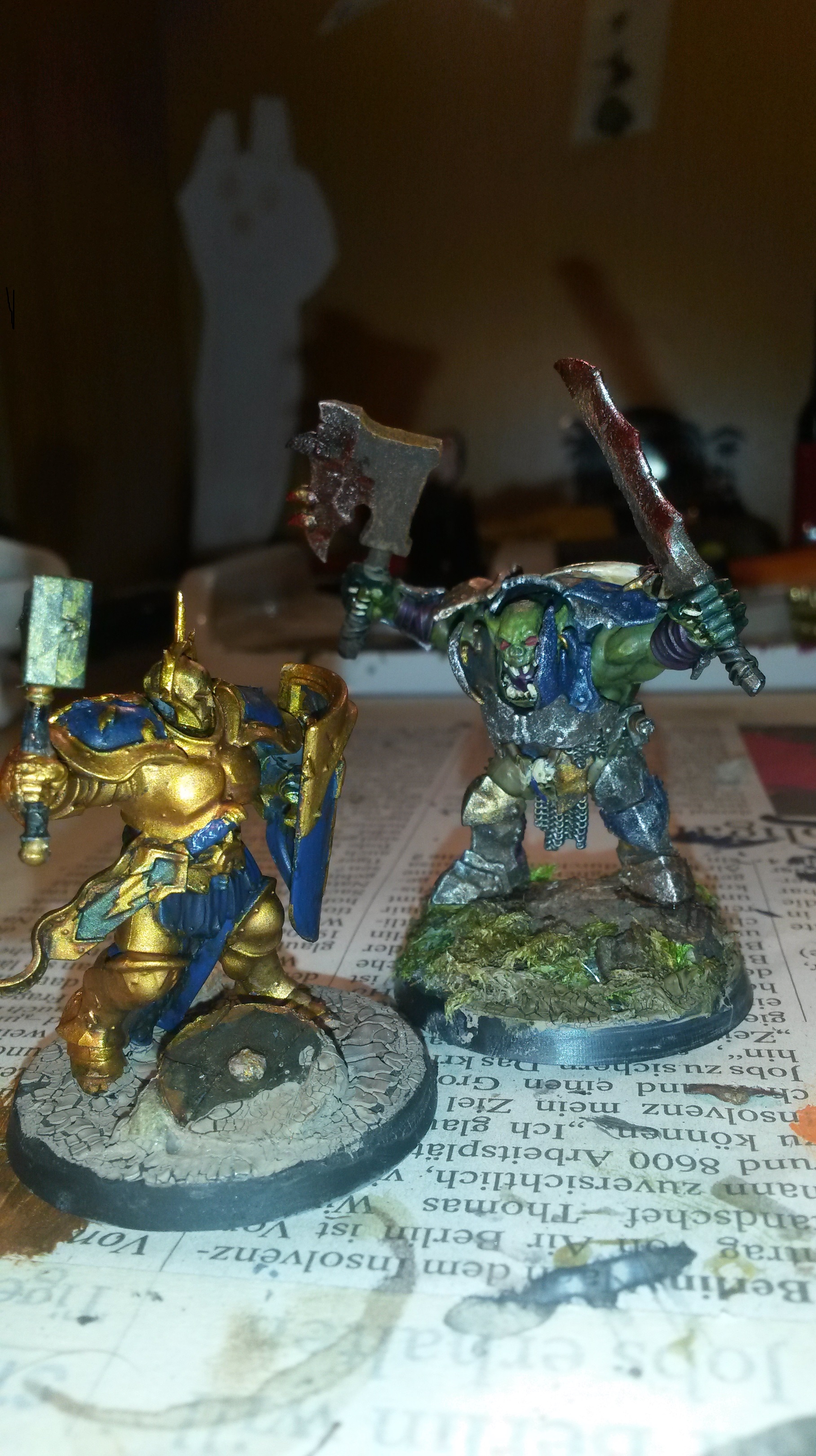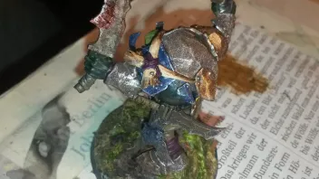 Es fehlt die Verzierung für die eine Schulter und das seitliche Schwert. Das werde ich aber erst machen können wenn ich die nötigen Farben hab. Bei den Zierplatten hab ich mich von den Farben aus den Retributor-Einsteiger-Set bedient. Das waren dann wohl auch seine ersten Opfer