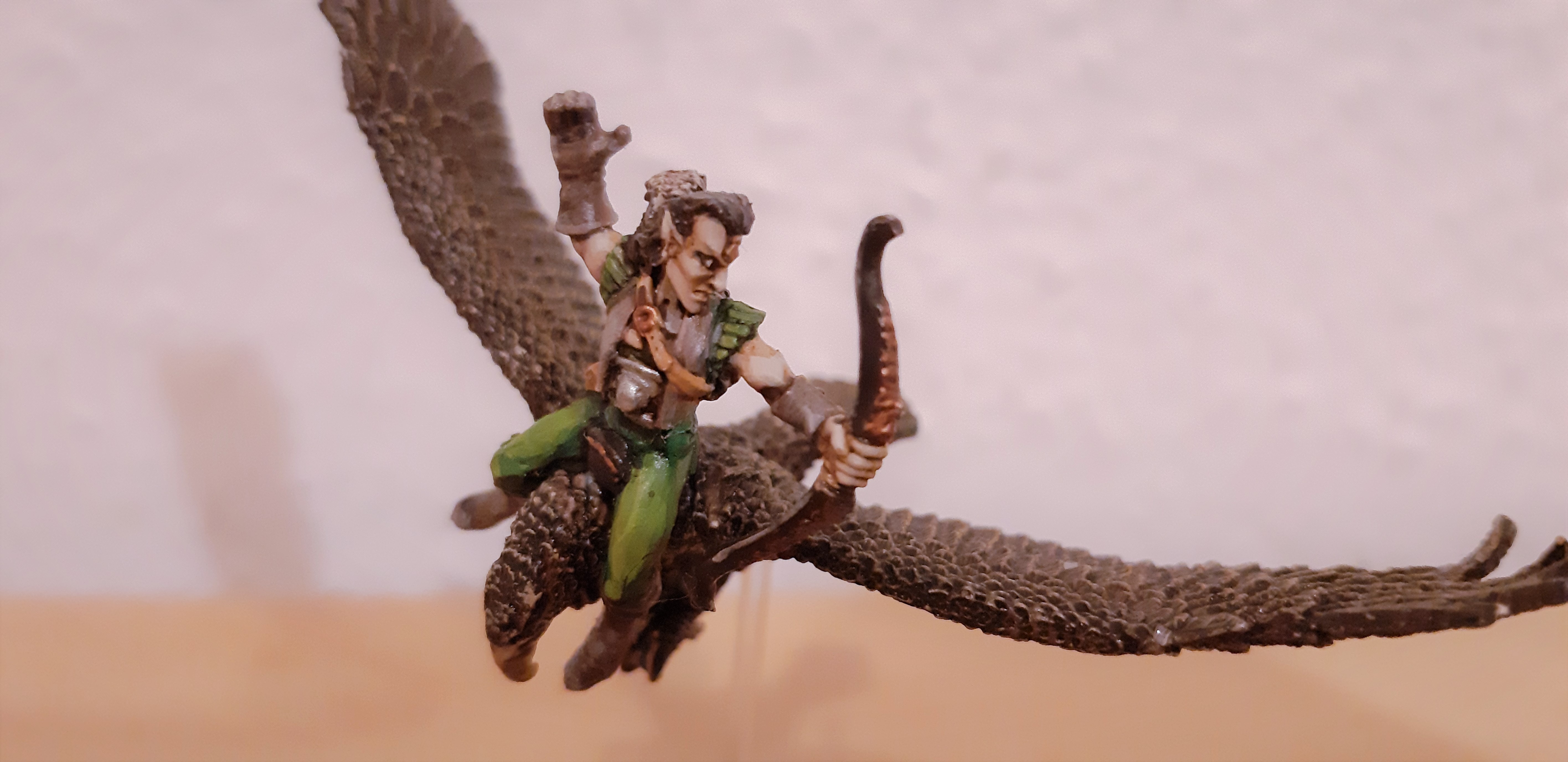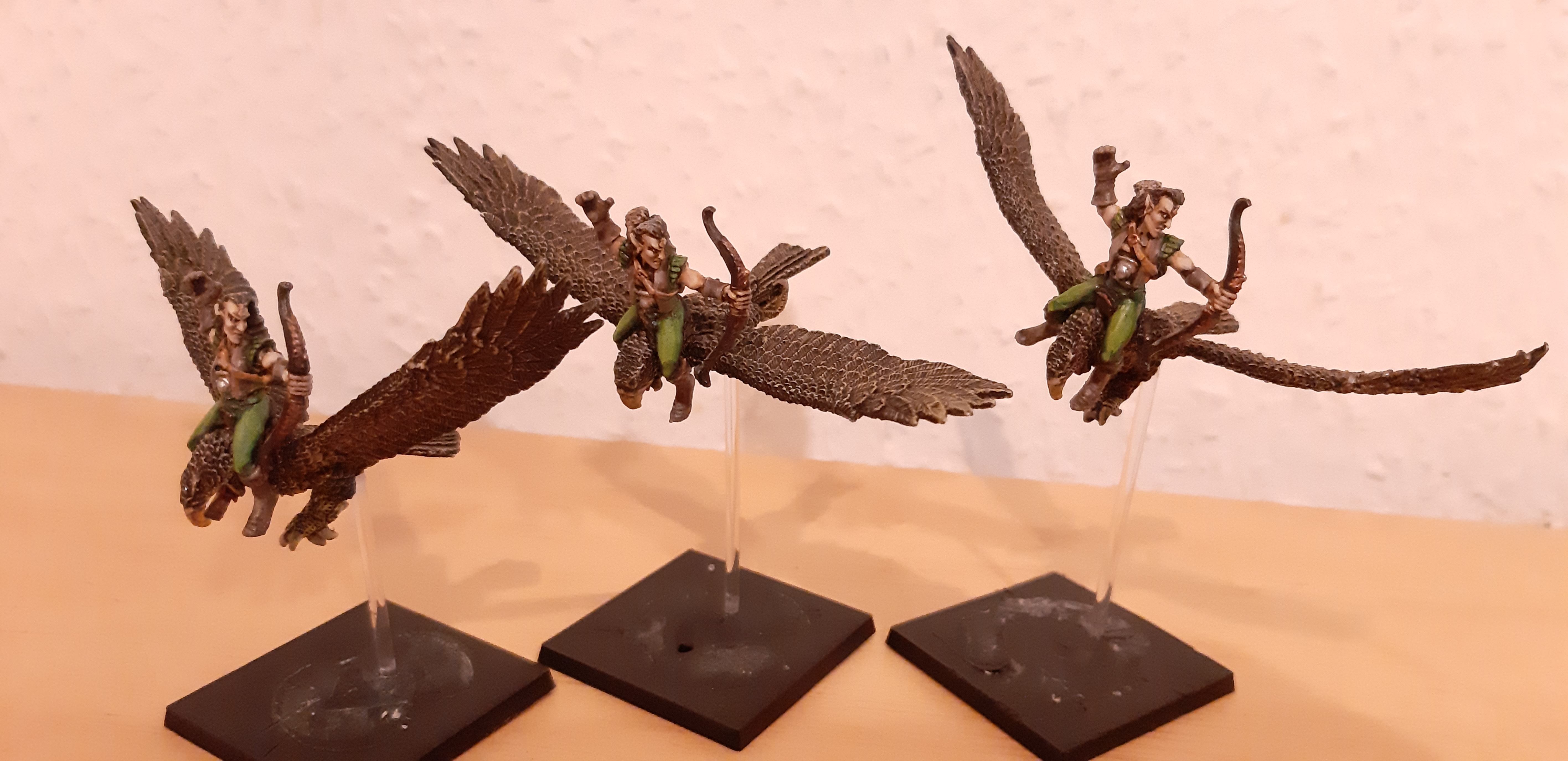Wie hast du das denn mit den Flugbases gemacht? Man kann die Modelle nur schwer nebeneinander stellen wenn man die Stäbchen mittig auf der Base montiert und alle auf gleicher Höhe sind.Das funktioniert bei den alten nur, weil die in eine Richtung fliegen und die Schützen 90° gedreht zielen. Also in Blickrichtung alle zum Feind und die Falken fliegen Schnabel an Schwanz in eine Andere Richtung.