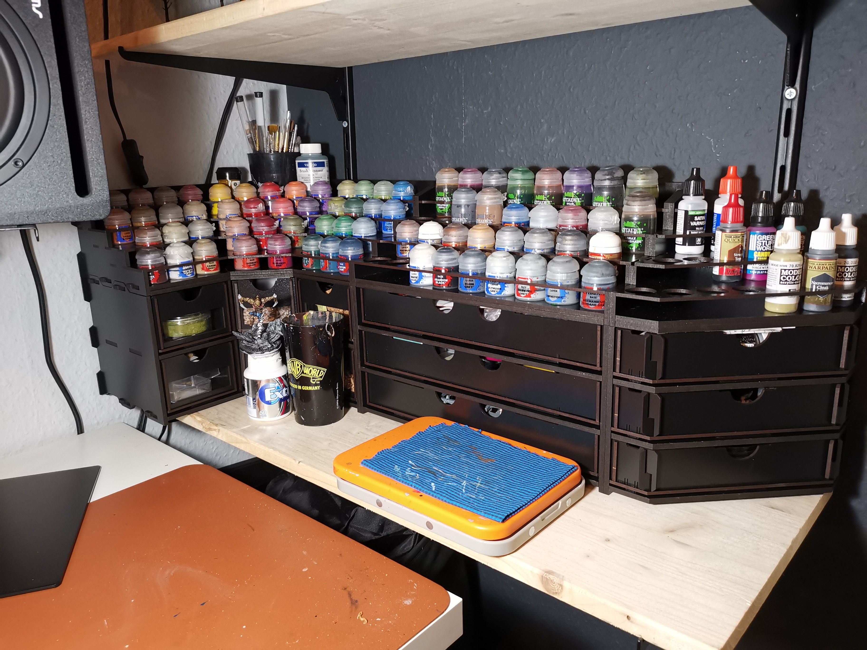 Die einzelnen Module sind super wertig verarbeitet und der Aufbau ein Kinderspiel (auch wenn von jedem einzelnen Stück Holz die Schutzfolie abzuknibbeln doch schon etwas nervig war). In der Station ist super viel Platz und fast mein gesamter Hobbybedarf ist nun darin verstaut (von 4 "Nebenkisten" habe ich nun nur noch 2, hauptsächlich mit größeren Sachen wie Sprühdosen).