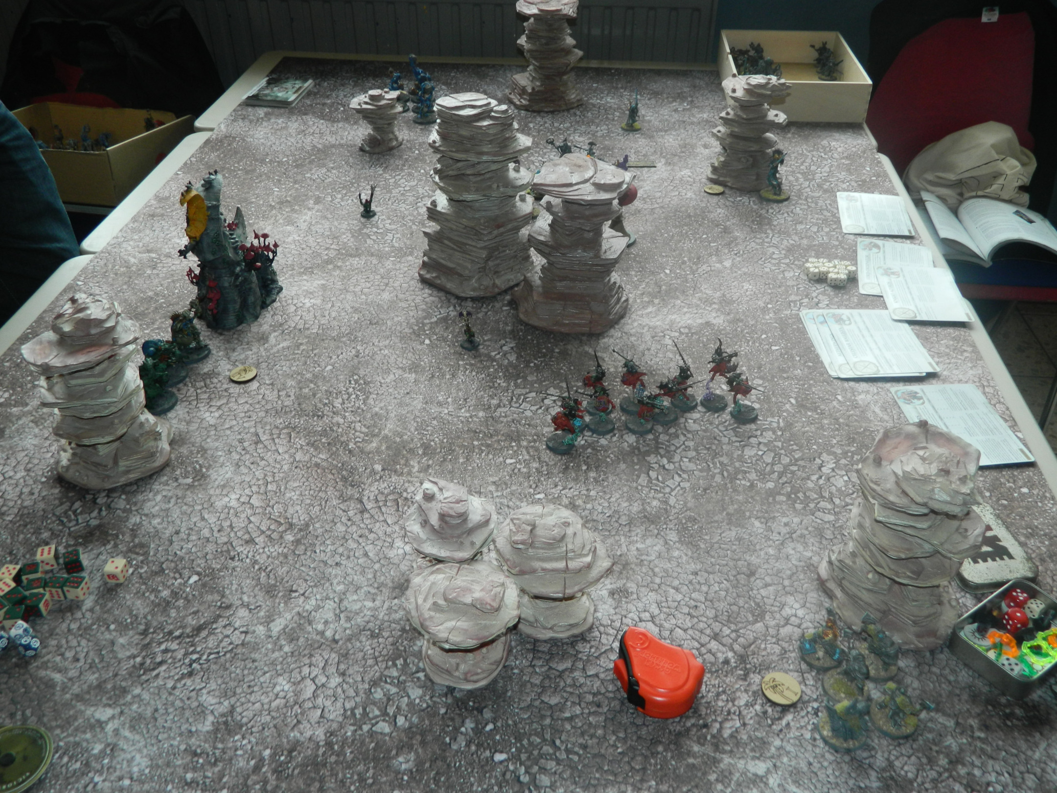 Da hast du nicht unrecht, dass es so aussieht, dass wir uns unabhängig voneinander durchkämpfen. Das haben wir wohl so gemacht weil wir beide die maximale Warbandgröße von 5 Modellen hatten. Tobi und ich hatten uns nicht im voraus abgesprochen, was die Warbandgröße oder die Taktik für das Spiel angeht. Auf jeden Fall war es aber keine bewusste Entscheidung, so vorzugehen, sondern hat sich durch den Spielverlauf so ergeben. In den Spielen mit meiner Familie spielt jeder nur eine Warband aus 2 Modellen, da ergibt es sich eigentlich immer automatisch so, dass wir lieber möglichst zusammen bleiben. Schlauer wäre in unserem Spiel wohl gewesen, wir hätten beide Warbands an der gleichen Stelle aufgestellt, um uns gegenseitig besser unterstützen zu können.