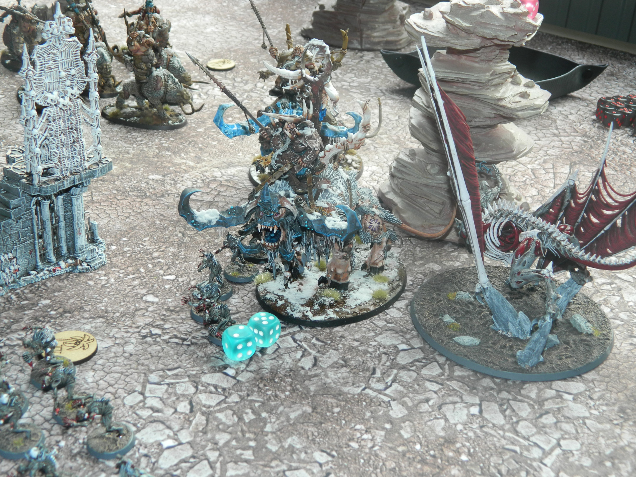 Die Beastclaw Raiders sind übrigens die Armee, die Cocked in dem ersten Spiel komplett überfahren hat. Man rechnet halt nicht unbedingt damit, dass der Frostlord auf Stonehorn ein Artefakt hat, das ihm +4 Move und Flugfähigkeit gibt, womit er quasi automatisch einen First Turn Charge macht. In dem Spiel hier gegen die Legion of Sacrament hat er versucht Arkhan im ersten Zug auszuschalten, wobei er den Charge (war 8 oder 9 Zoll) auch beim Reroll nicht geschafft hat und dann in der Chainrasp Horde aus 40 Modellen feststeckte, die ihn dann totgeprügelt hat, wobei er natürlich etliche davon mitgenommen hat.