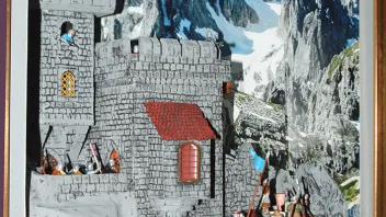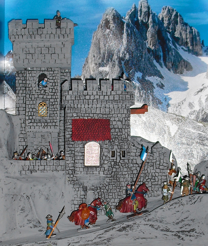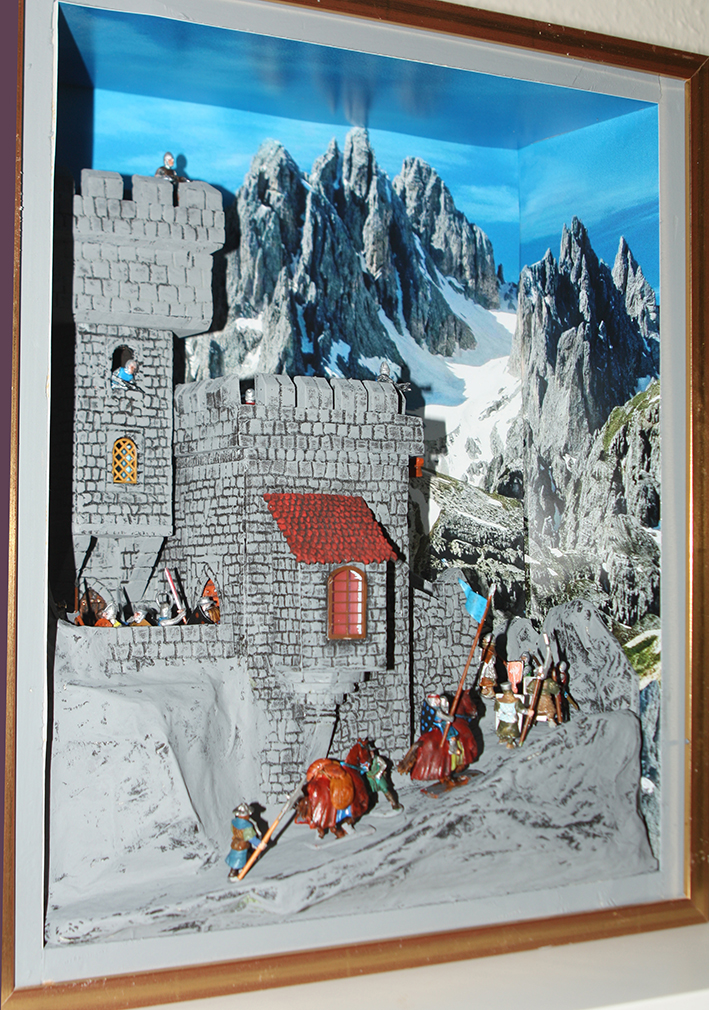 Habe eine hier gezeigte Burg umgebaut und ein bißchen mehr Leben reingebracht. Der Rahmen und die Bases müssen noch überarbeitet werden, ansonsten aber ist das Teil- eine Fluchtburg in den Bergen, soweit fertig.!