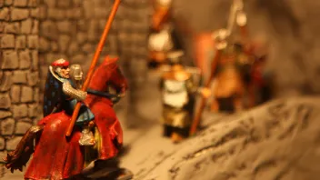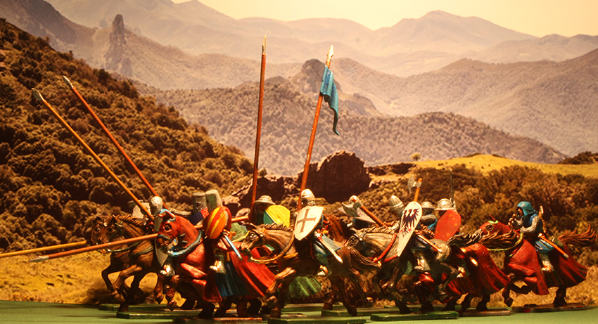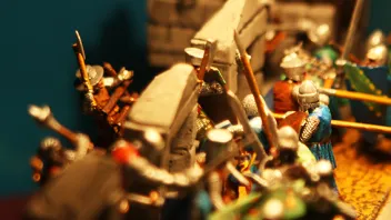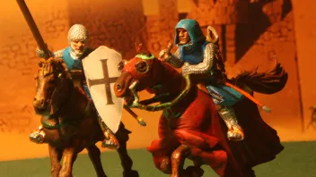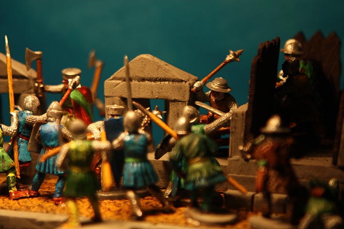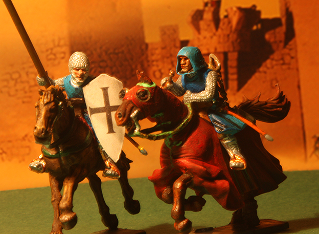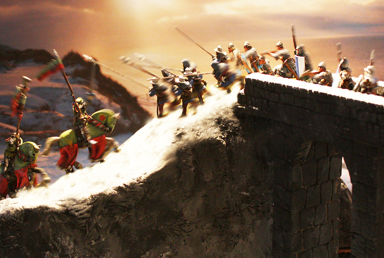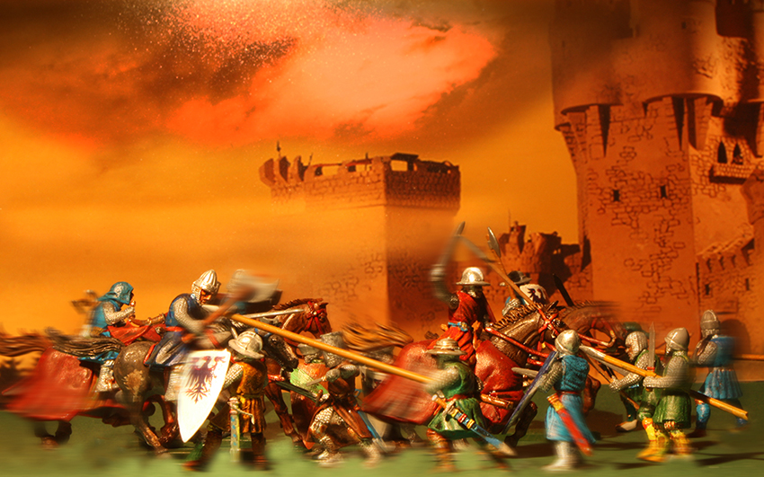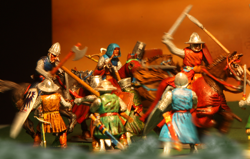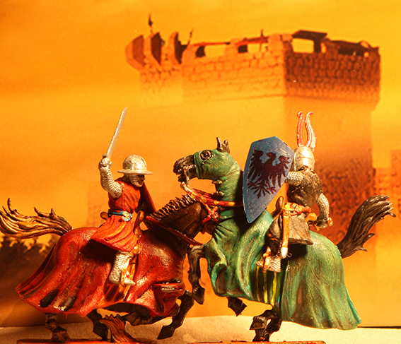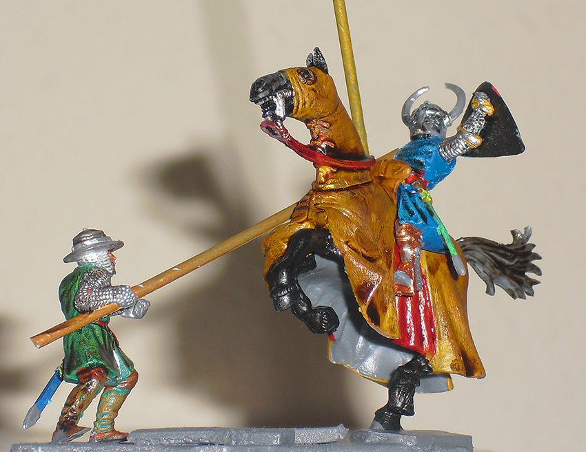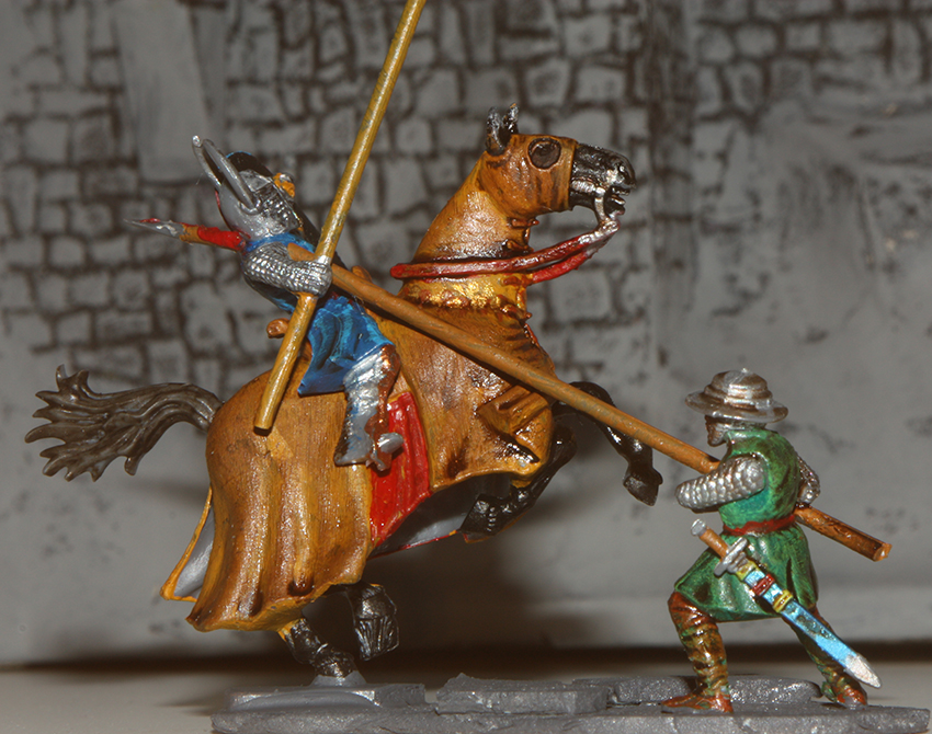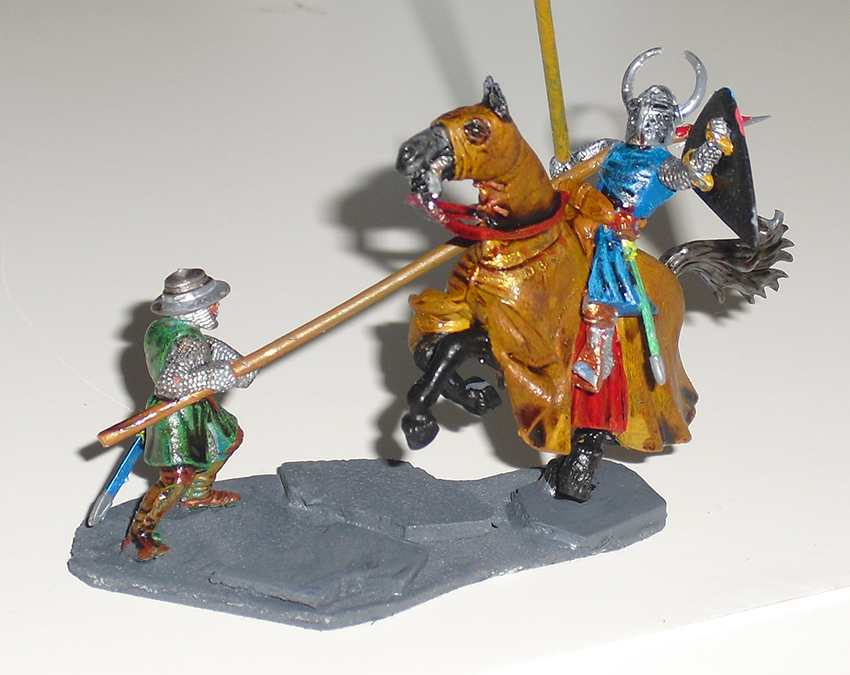 anbei habe ich mich mal an einem Zweikampf probiert. Ist nicht der Beste, aber ich finde so`n kleinen Umbau ganz nett? Oder? Gerade ist mir aufgefallen, daß ich vor lauter Begeisterung vergessen habe, den Mantel des Pferdes innen auch anzumalen!