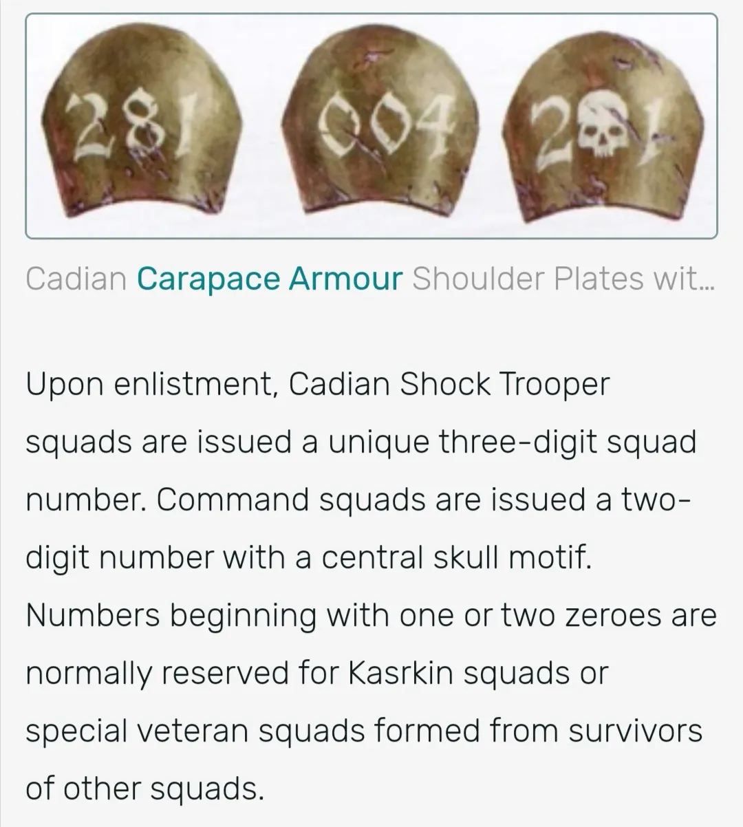 Cadian regiments are organized around a core of companies, anywhere from two to thirty depending on a variety of factors when it was raised (...)Infantry companies, normally between one to four hundred men each, are led by a command squad and consists of between two to six platoons, as well as any additional support units attached to the company, such as a squadron of Sentinels and a Sentry Gun battery. Each platoon will be led by its own command squad and consist of between two to six squads. Normal infantry squads are given a unique three-digit identifier, while command squads use a two-digit number with a central skull motif; special veteran or Kasrkin squads use a three-digit number beginning with one or two zeros.