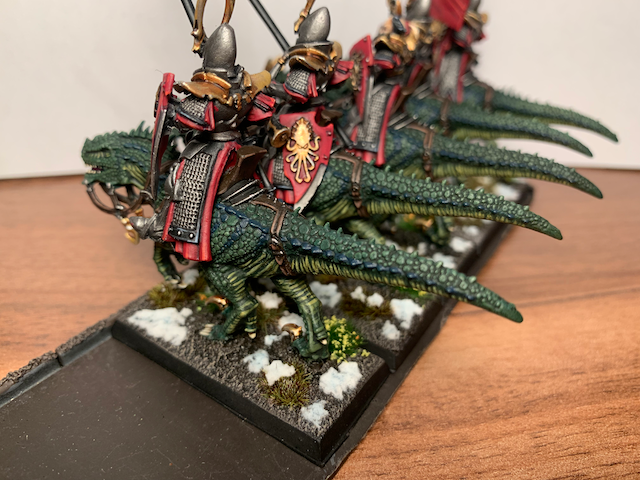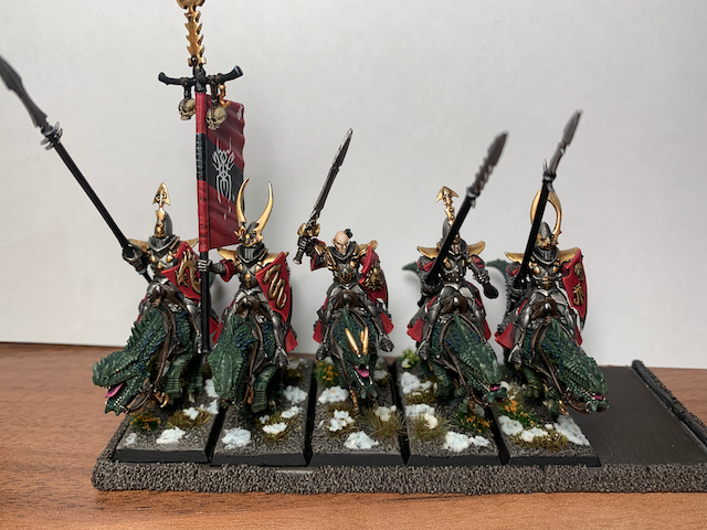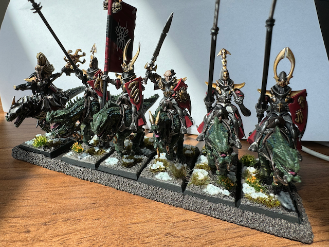 Den Abschluss der aktuellen fertigen Projekte machen meine Dunkelelfen. Die Echsenreiter hatte ich jetzt seit ~12 Jahren in verschiedenen Boxen gelagert, sie zwischendurch immer mal angefangen zu bemalen und wieder abgebrochen und war nie zufrieden. Nun nicht mehr.
