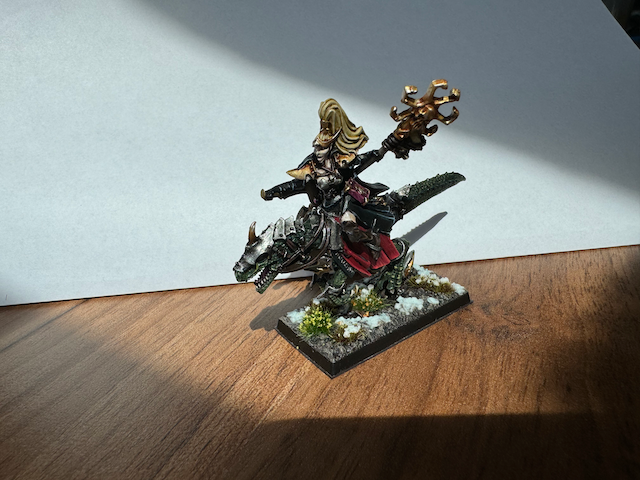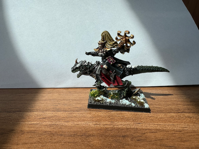 Meine Dunkelelfen haben Verstärkung in Form einer berittenen Zauberin bekommen. Ich hab mich dazu entschieden die Haare Blond zu halten um das Model nicht zu dunkel werden zu lassen und da ich auch hier mit dem Ergebnis sehr zufrieden bin habe ich mir vorgenommen bei allen Elfenarmeen von mir die Haarfarbe an den Modellen immer bei Blond und einer weiteren Farbe zu halten, auch um zu zeigen, dass es mal das gleiche Volk war und jedes sich dann in eine andere Richtungen entwickelt hat. Bei den Waldelfen ist es Blond und Orange, bei den Dunkelelfen Schwarz und Blond und bei den Hochelfen werde ich mich auf Weiß und Blond festlegen. Ausnahmen kann ich mir bei Characktermodellen vorstellen, die zwar in einem Volk sind, aber auch Tendenzen eines anderen haben.