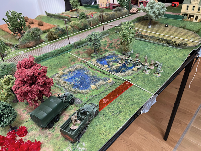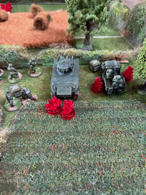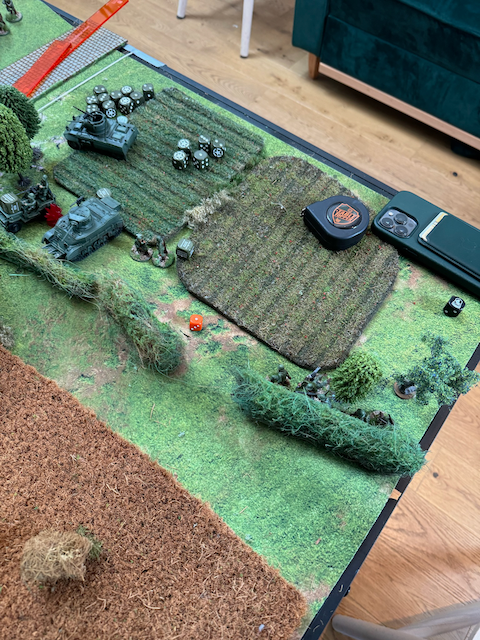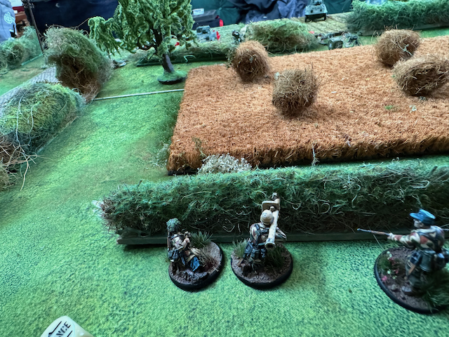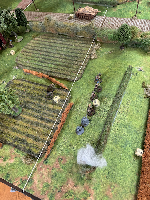 In der ersten Runde versuchen meine Truppen die Hecke in der Mitte des Spielfelds zu erreichen währen Grimgorki mit einem mechanisierten Vorstoße auf der linken Flanke früh weit auf den Tisch vorstoßen kann. Auf der rechten Flanke bringen die USA Panzer und Scoutfahrzeuge aufs Feld, werden aber durch Panzerfaust und -Schreckbeschuss früh gepinnt und kommen an der Hecke zum stehen. Daran wird sich für den Rest der Partie nichts ändern und die US Army hat effektiv geparkt