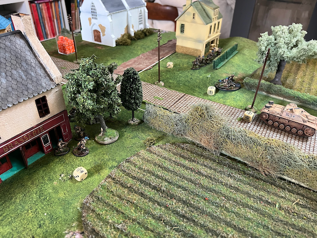 Auf der rechten Flanke fähren mittlerweile die Panzer auf, können auber durch einen kombinierten Beschuss aus Panzerschreck (der hat tatsächlich mal getroffen!) und -faust effektiv zum stehen gebracht werden. Im Verlauf der Partie wird sich an dieser Flanke nicht mehr viel tun und die US Army hat effektiv geparkt