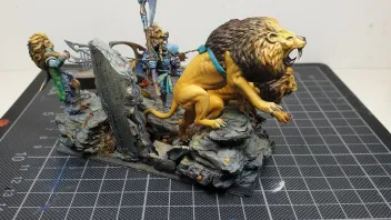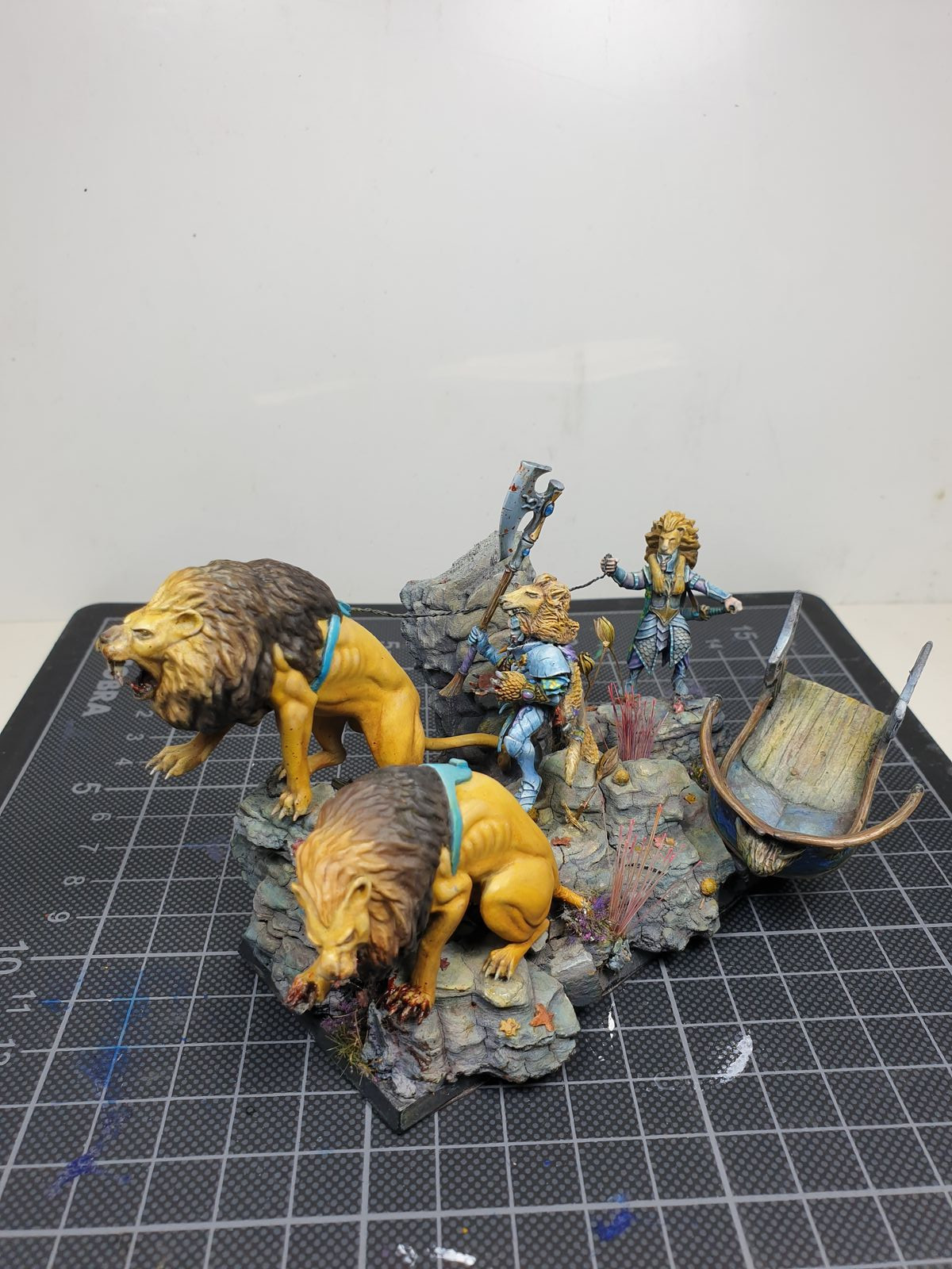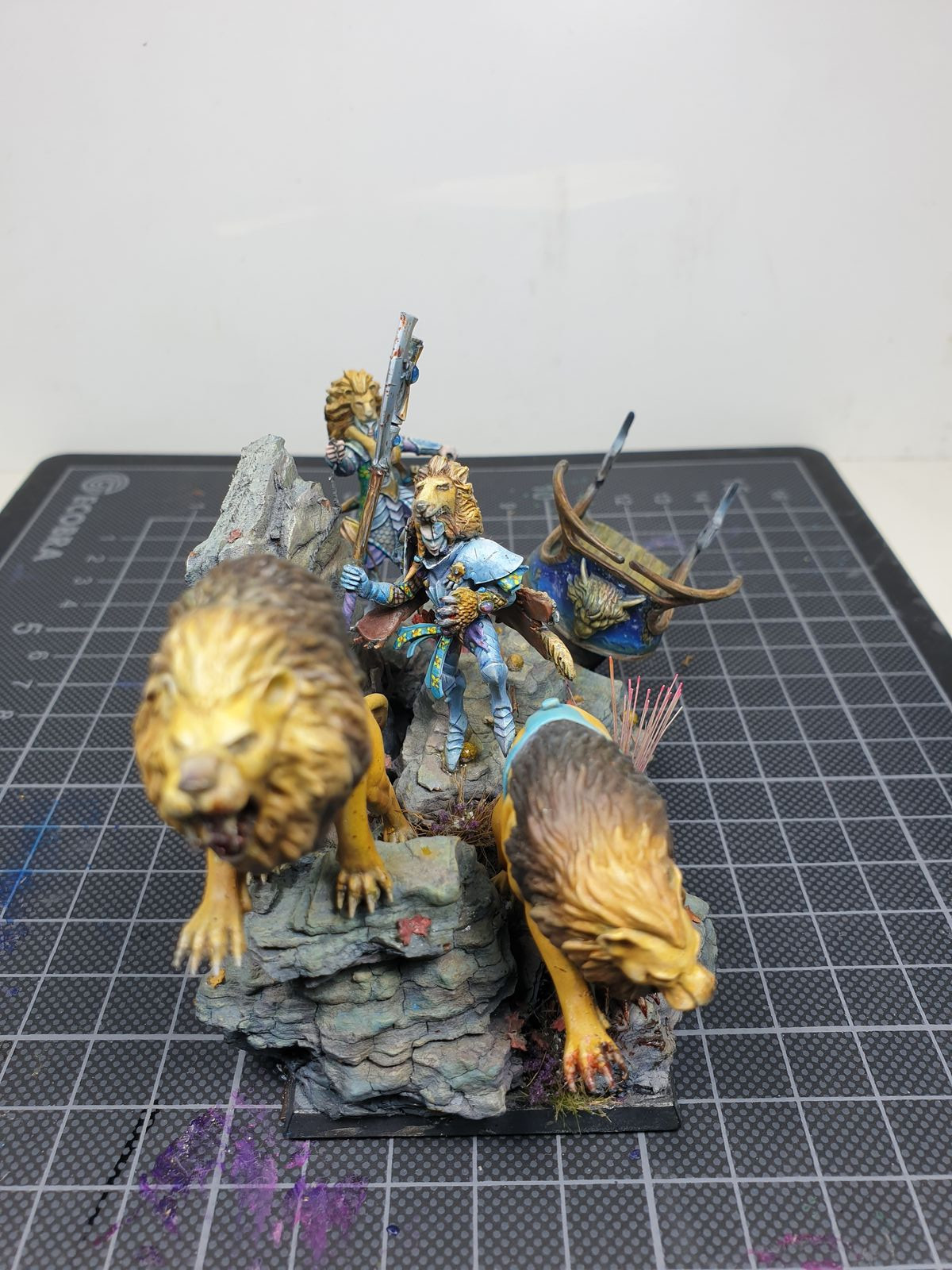 Kurz zu meiner Listenentwicklung: ich hatte die meisten Spiele der letzten Zeit immer zwei Combat Knaller aka Greifenjoe und MoCT Prinzess, Frosti, Pyro Ini und einen stabilen Block Flame Wardens dabei. Bevor der Nerfhammer kommt, wollte ich aber auch mal 2 Initiates testen - deswegen die Lion Queen statt Greif. Punktetechnisch fand ich's dann sinnvoller, die Schwerties und nen Cosmo Master zu nehmen statt FWs und Babysitter mit Psychospeer. Der Reaver Chariot ist dabei, weil ich das Modell fertig gemalt habe