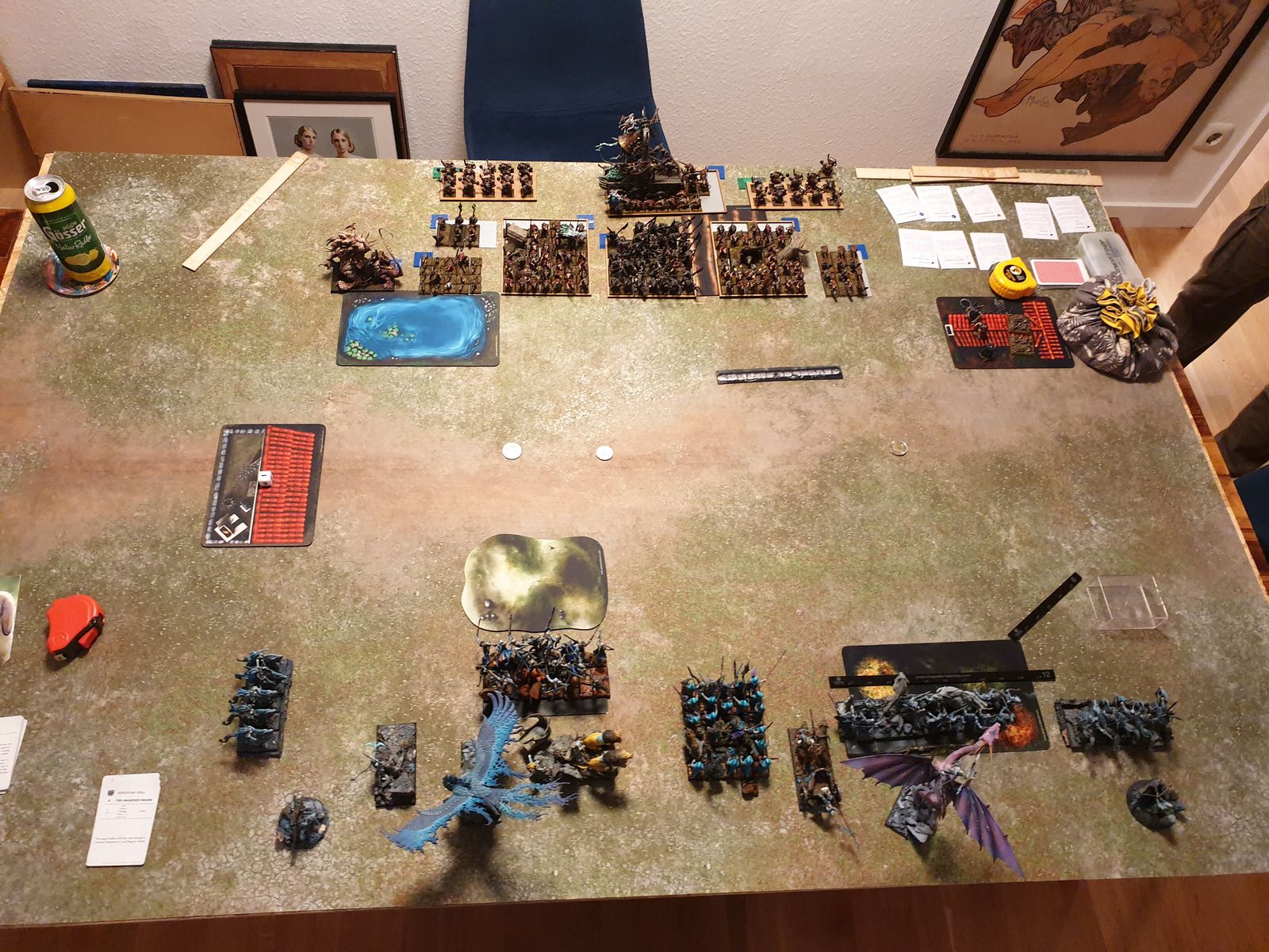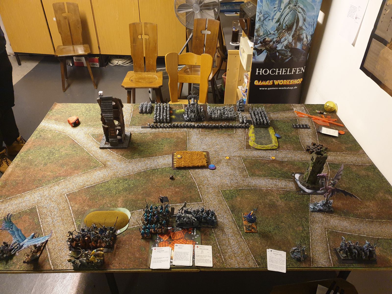 Wir haben auf A4 Hold und Dawn Assault gespielt, ich hab mir die Seite ausgesucht, wir traden bissi und der Homie schnappt sich den ersten Zug - traumhafte Testbedingungen für die großmäuligen Swordmasters.