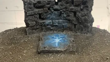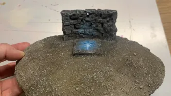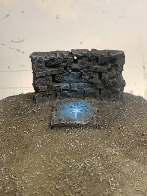 Um die Wartezeiten zwischen den einzelnen Schritten für die Platten zu verkürzen, hab ich mit dem Rest des Styrodurs, das ich für den See gebraucht hab, ein Geländeteil gebaut. Ich wollte unbedingt einen Leuchteffekt ausprobieren und hab einen "Ort der Macht" gebaut. Er ist noch nicht ganz fertig (Begrünung, Nachbessern bei der Bemalung, etc.), aber der Leuchteffekt ist schon nah an meiner Vorstellung.