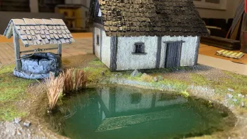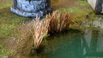 Der Teichbewuchs und der Zaun sind im übrigen Nadeln von einer Art Kiefer - hat ein Freund von mir im Garten stehen und hab ich gleich mal einiges gesammelt. Die kann man gut in die entsprechende Länge abbrechen, Büschel machen und die Unterseite in Leim tunken - fertig sind diese schilfartigen Büschel. Oder man webt sie um Holzpfosten, um einen Zaun zu machen.