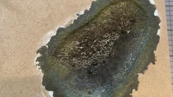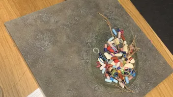 Das ganze soll dann mit Epoxidharz ausgefüllt werden. Dafür habe ich mal ein altes Geländeteil, das ich ganz am Anfang meiner WHFB-Karriere (also vor 14 Jahren) gebaut hatte, hergenommen, um das auszutesten. Diese Geländeteil ist ein Opferteich der Dunkelelfen, der seit seiner Entstehung auf "echtes Wasser" gewartet hat - also perfekt, um als Übungsstück herzuhalten.