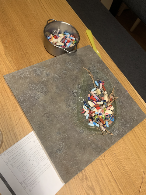 Dann wurde der See mit Sand, Korkstücken und Leim gut versiegelt und bemalt.