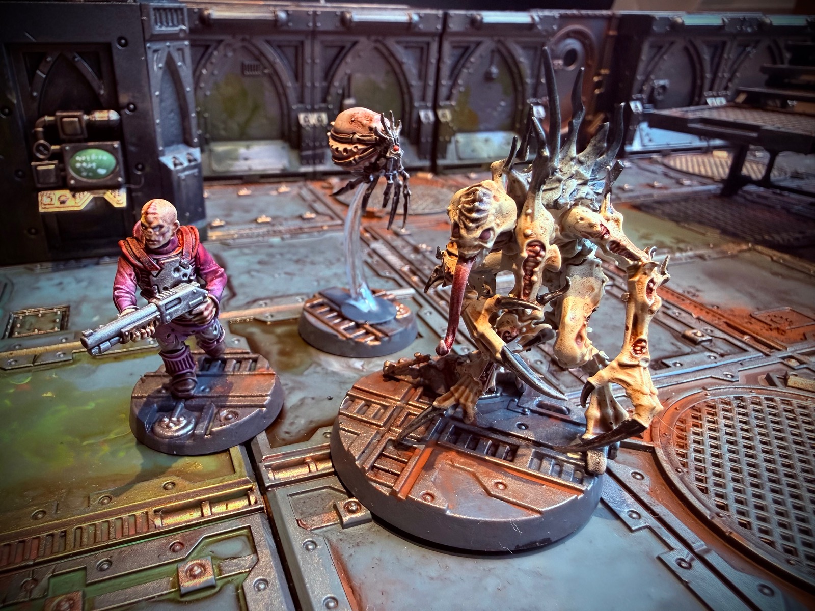Die Xenos von vorhin kamen aus der westlichen Ecke der Halle gestürmt. Malstrain! So verdorbene Genestealer, dass selbst der Schwarm sie verstieß. Das war nicht gut.
