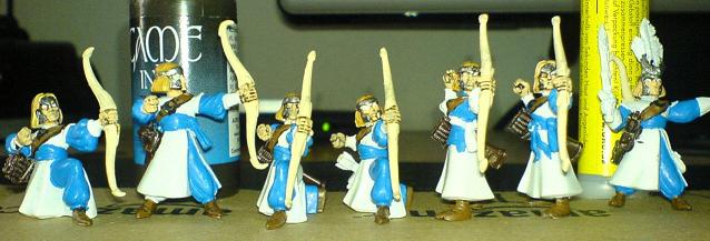 Hab jetzt mene ersten Bogenschützen :-) Überlege gerade, wie ich sie anmalen sollte. Die Rüstung Silver oder lieber Chainmail? Weiß kommt mit rein und dann Blau? Fäne ich etwas langweilig (so stehts ja schon im Armeebuch). Finde das Modell mit Türkis im AB ganz nett. Hab ihr da Tipps zu? Wie kan ich Türkis akzentuieren?