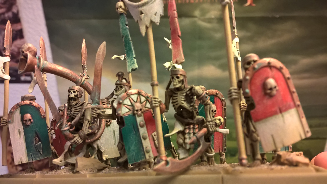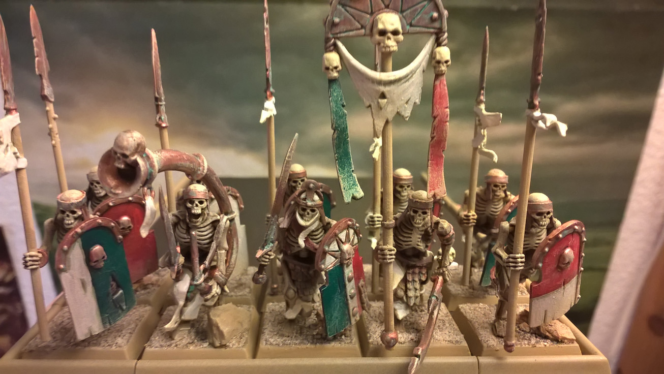 Hier die ersten fertig bemalten Modelle. 10 Skelettkrieger mit Speer und Schild + vollem Kommando. Im Spiel werden sie wohl nie wirklich Speere tragen, doch die machen einfach optisch mehr her und passen auch besser zum Khemri Stil, wie ich finde.