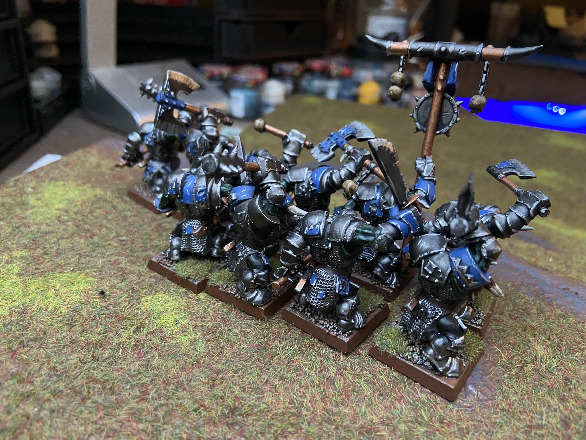 4. Deine Strategie sollte so aussehn: Stell dich in eine ecke und warte. Bis der Gegner kommt feuerst du mit allem was du hast auf ihn damit du ihn weichkochst. ( hierfür könntest du dir evtl. noch ne Balliste zulegen ). Kurz bevor er vor dir ist stürmst du los ( evtl. mit heroischer Bewegung ) um ihm so deine Nahkampfordnung aufzuzwingen. Die Krieger sollten dabei die Masse angreifen ( kannst sie ruhig in Kontakt mit 2 - 3 Orks, Goblins etc. bringen, die schaffen das ). Die Khazadwachen ünterstützen entweder die Krieger oder greifen Elitetruppen an, wie z. B. Uruks, gepanzerte Goblins usw. Der Held kämpft gegen feindliche, namenlose Helden ( bei Goblins immer zuerst den Schamanen!! )
