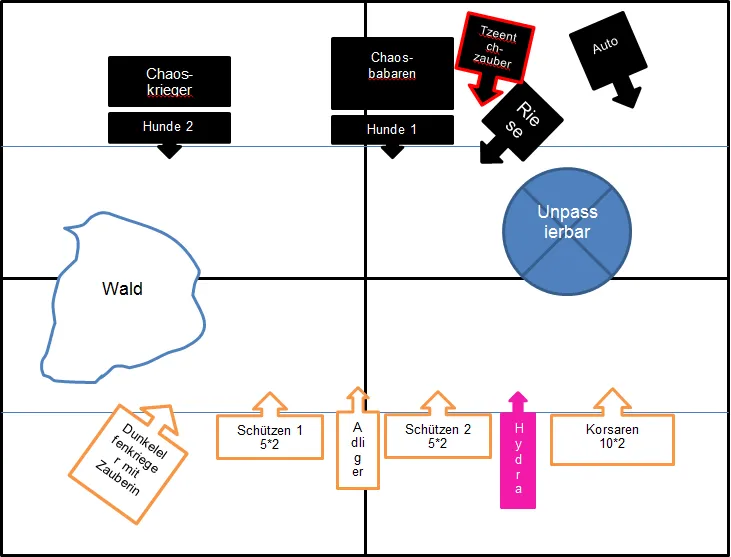 Die Korsaren rücken sich in Position, da der Nahkampf mit dem Streitwagen wohl unabdingbar sein wird, die Hydra wagt sich nun weniger weit vor, was aber diesmal wohl an den Treibern liegen mag, der Adlige bringt sich in Position um nächste Runde die Chaoskrieger anzugreifen, Repetierarmbrustschützen bleiben wo sie sind, ist ja alles in guter Reichweite. Trupp der Erzzauberin bewegt sich ebenfalls in eine bessere Position.