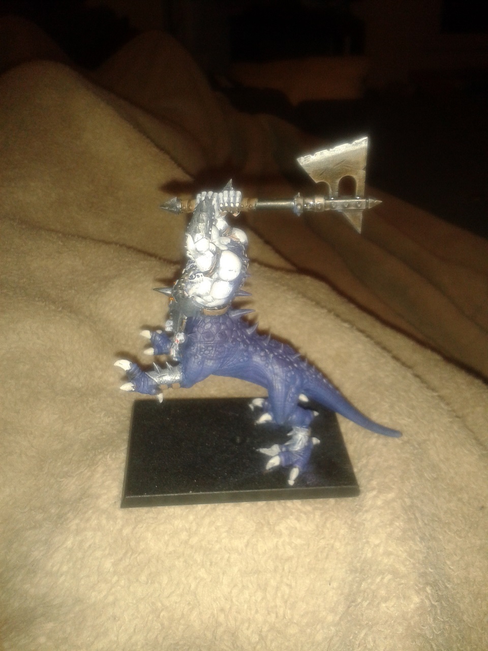 Der körper hat blau untergemischt bekommen für die hautfarbe. Die schuppen des "Drachenkörpers" habe ich erst mit naggaroth night geschichtet, dann mit einem 2:1 mix aus naggaroth und hormagaunt purple gebürstet, dann hab ich das ganze mit verdünntem kantor blue getuscht und anschließend die schuppen auf dem rücken welche den stachelkamm umfassen mit nem 1:1 mix aus hormagaunt purple und naggaroth night gebürstet