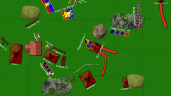 Die Ungors I gehen so in Position das die RdK II nicht direkt auf die Gnargors gehen können. Ausserdem stoppen sie die beiden Streitwagen genau ausserhalb des Sichtfeldes der Pegasi III - letzteres sollte man unbedingt bei der Bewegung mit ansagen, damit die Bretonen das absegnen können.