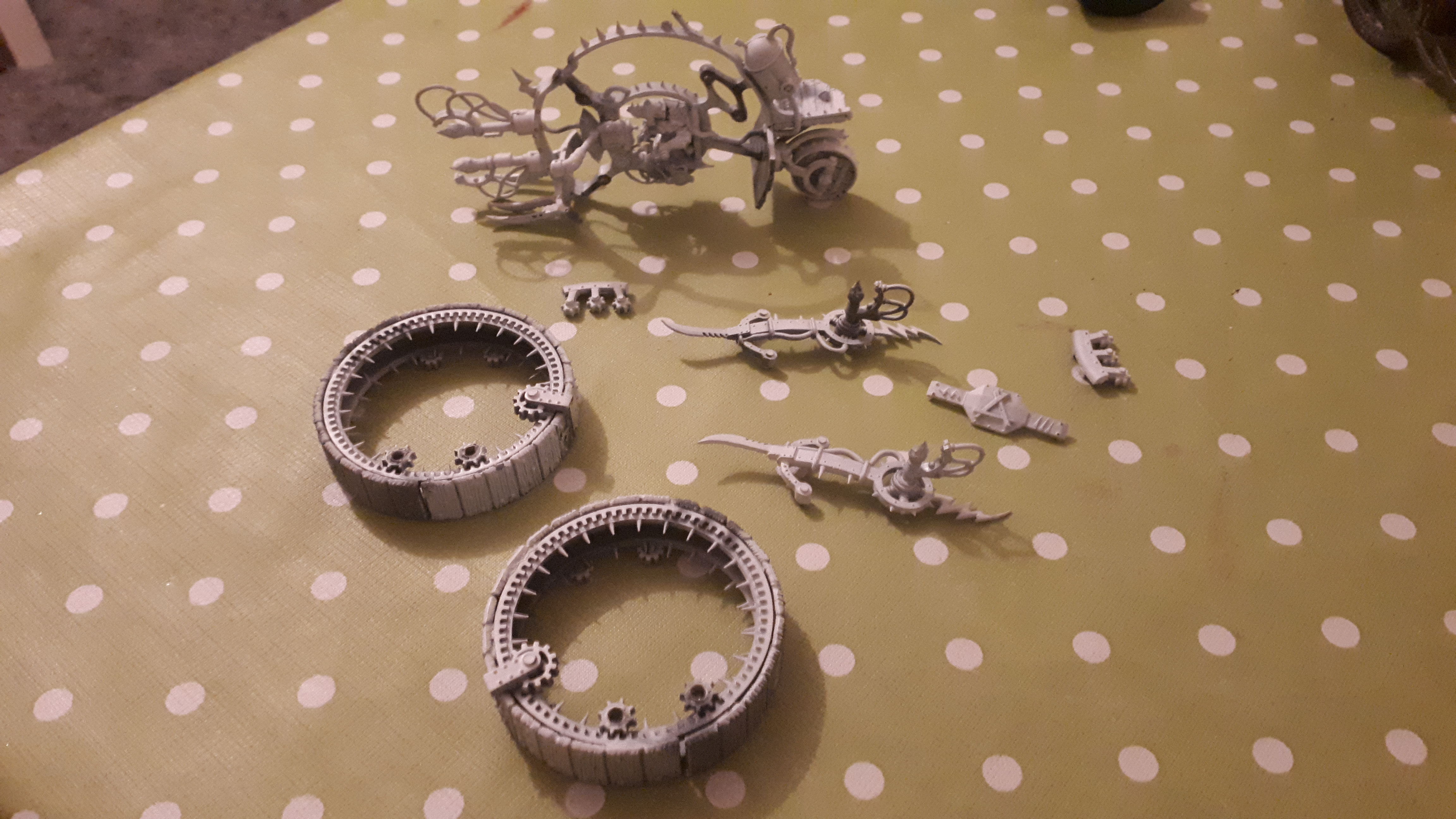 Hier mal eine ältere sache, hatte gebraucht 2 skaven doomwheels gekauft diese waren grundiert und halb angemalt, ich habe besagte doomwheels dann vorsichtig zerlegt neu grundiert und bemalt... Die stehen mittlerweile auf bases aber die sind noch nicht ganz fertig weil ich nicht zufrieden bin, aber mein handy macht zu große bilder deswegen kann ich sie grade nicht hochladen