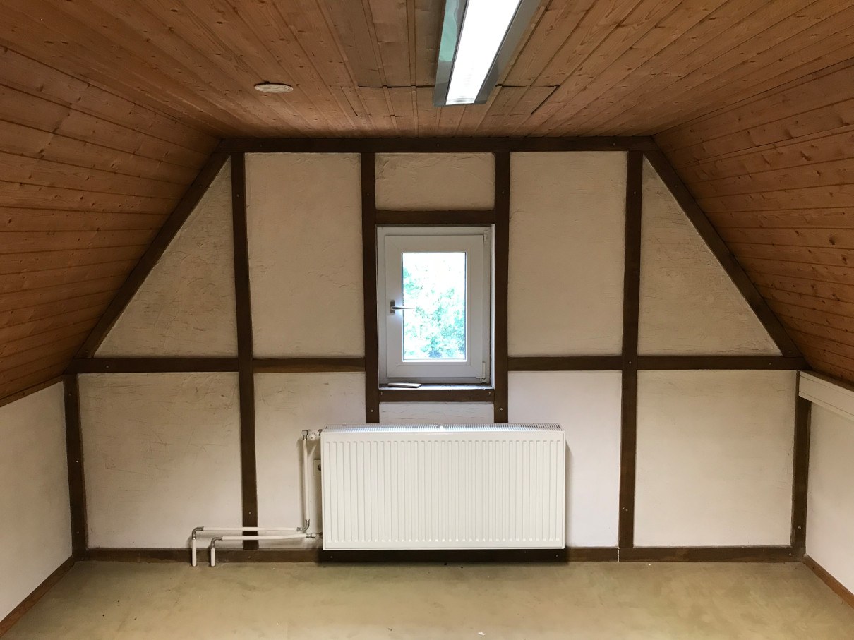 Die Trockenbauwand ist fertig und die Türzarge eingebaut,in der Fake Fachwerkwand sind die Gefache gestrichen und zwei von drei Wänden tapeziert.