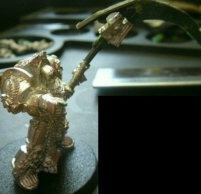 Der Ordenspriesterumbau ist wie man sieht der Standard Ordenspriester mit Rosarius und Sturmbolter. Die Sense ein Eigenbau aus den Ruinen von GW, und ner Menge Greenstuff, leider auf dem Bild noch nicht fertiggeschliffen.