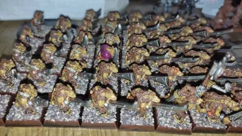 Hier abgebildet sind natürlich (fast) alle meiner Modelle der Skaven. Für den besseren Überblick (finde ich) hab ich große Blocks aufgestellt. Natürlich kann ich meist keine 80 Seuchenmönche Spielen (wir Spielen 2000 Punkte). Wenn ich 20er oder 40 Blocks stellen würde brauch ich zu viel Platz