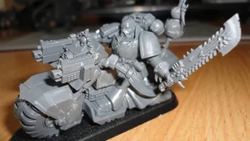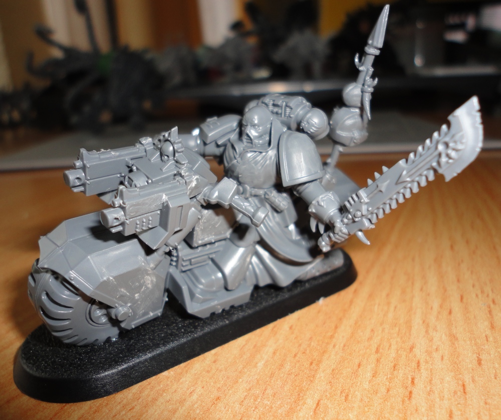 Umgebauter Dark Angels Ravenwing-Biker. Hier wurden alle Dark Angel Ornamente vom Körper, Fahrzeug und den Waffen entfernt und teilweise Alternative Waffen angebracht. Der Rest folgt dann über die Bemalung.
