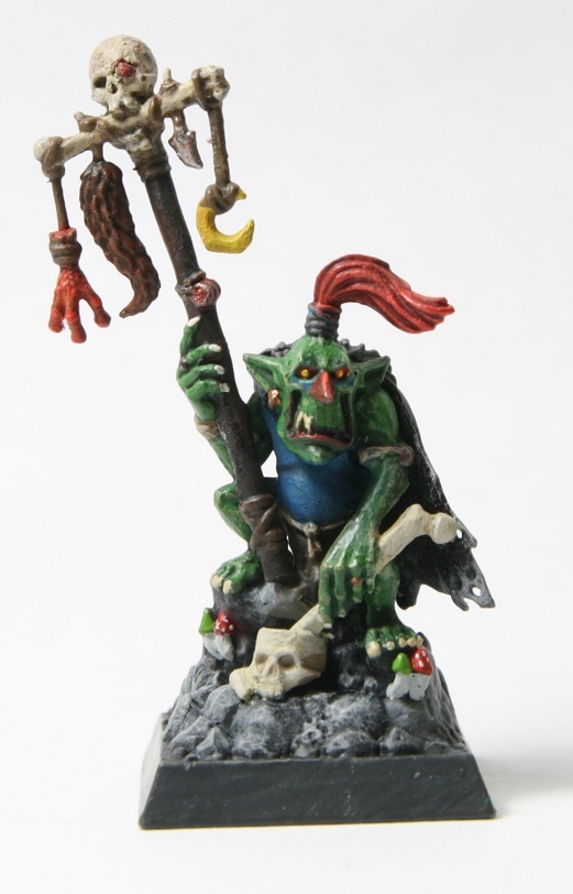 Meine Nachtgoblins haben jetzt etwas Verstärkung bekommen von einem Goblin-Schamanen. Da habe ich mich das erste mal ein wenig mehr in Schattierung und Akzentuierung versucht. Hoffe es gefällt!