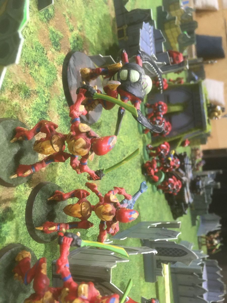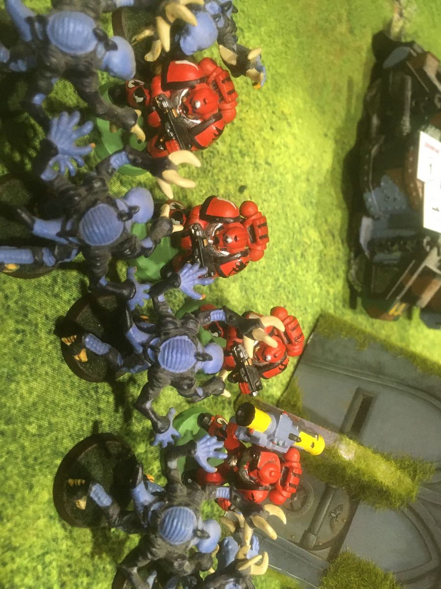 Die Tyranidenkrieger erklommen die Plattform und zerschnetzelten den Techmarine, der Commander hielt sich lange, wurde aber nach und nach vom Schwarmtyranten niedergerungen, der Scriptor wurde vom Zoanthropen gegrillt und die Symbionten erledigten den zweiten Taktischen Trupp...Der erste Trupp wurde gemeinsam vom Carnifex und den Tyranidenkriegern während ihres Sturms zum Missionsziel zerschlagen und floh dann in verschiedene Richtungen, ohne sich wieder sammeln zu können!