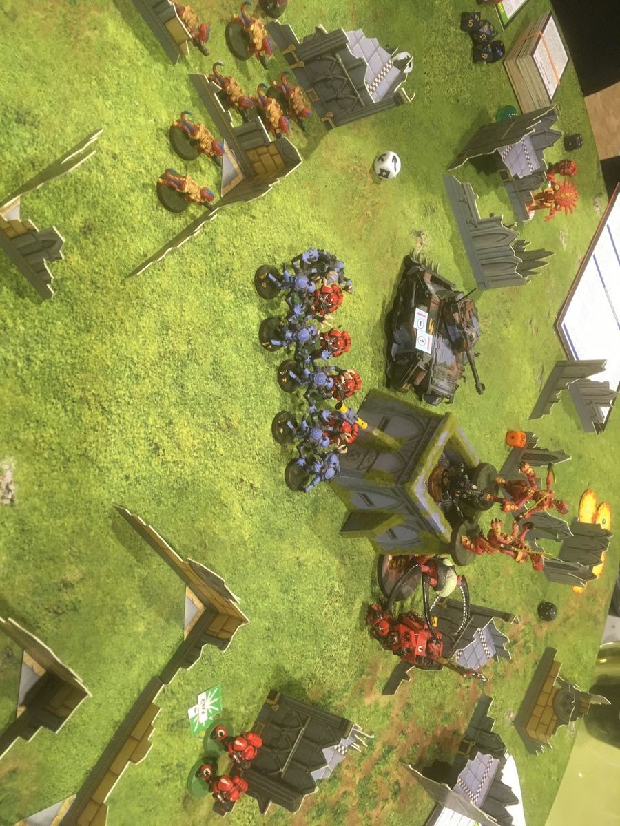 Die Blood Angels waren umzingelt und hatten als Missionsziel, die zentrale Plattform frei von feindlichen Modellen zu halten, um dem Thunderhawk eine sichere Andockstelle zu gewährleisten...Der Techmarine befand sich zwar auf der zentralen Plattform, aber es war dennoch durchaus möglich, dass beide Seiten ihre jeweiligen Missionsziele erreichten und die dafür angesetzten fünf Siegespunkte erhielten; es war also ratsam, auch weitere Quellen für Siegespunkte im Auge zu haben, statt sich ausschließlich am Missionsziel festzubeißen!