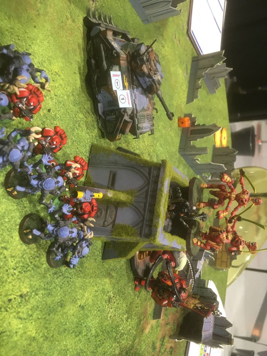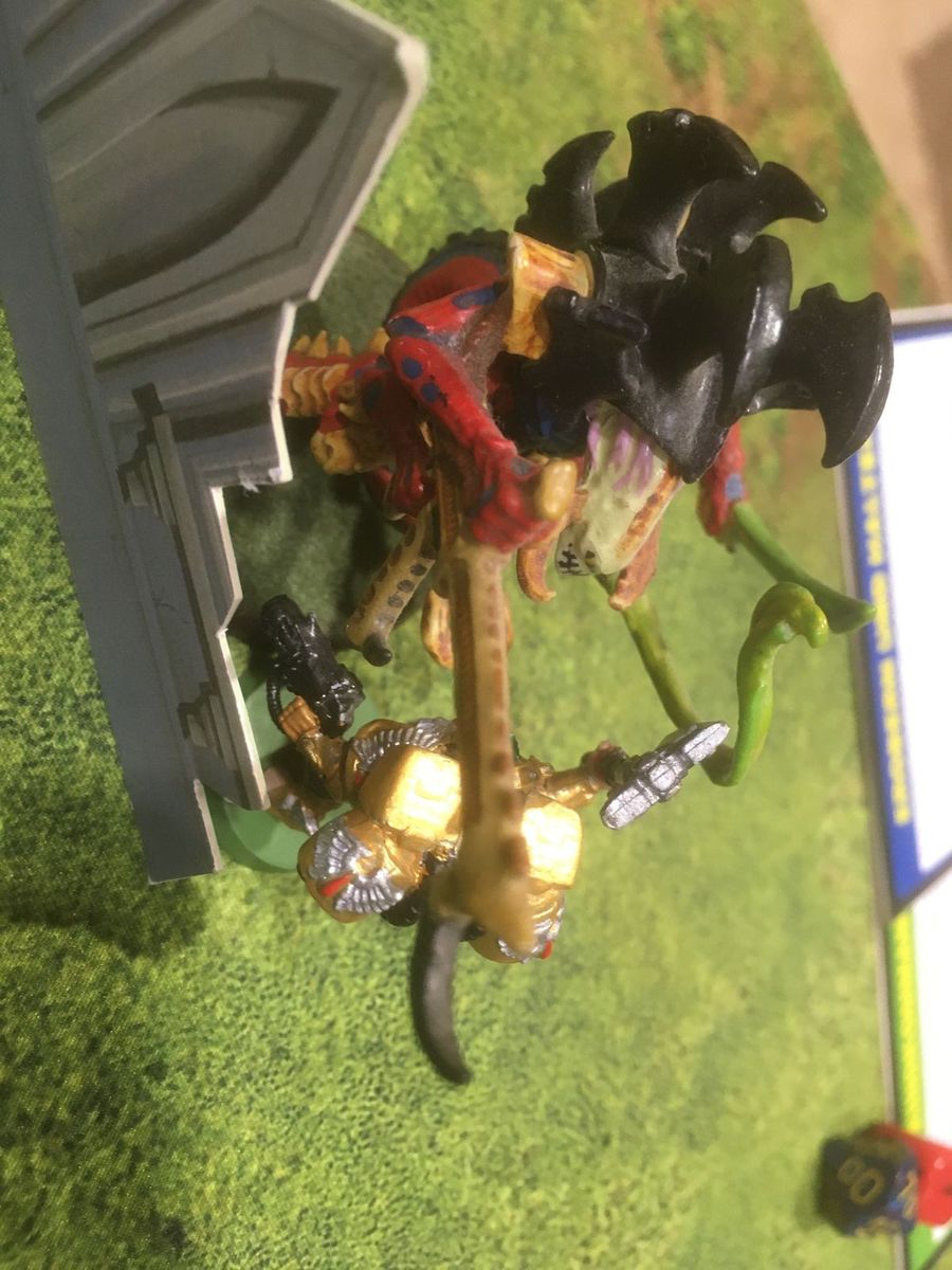 Der gegenseitige Beschuss sorgte für nur geringe Verluste auf beiden Seiten und die Biozidkanone des Schwarmtyranten beschädigte den Predator an einer Seitenkuppel und den Ketten...Sein "Alptraum" aber verbreitete überraschend viel Panik unter den Space Marines, was insbesondere den Scriptor schwächte!