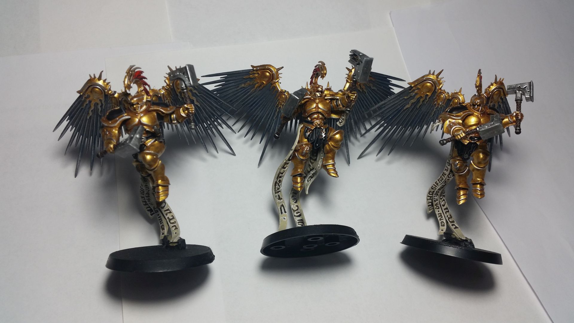 Habe die Flügel mit Celestra Grey bemalt und dann zwei Mal mit Guilliman Blue glasiert. Jetzt wäre die Frage nach dem nächsten Schritt... entweder mit einem sehr hellen Grau bürsten, oder das helle Grau mit Lahmian Medium mixen, und mehrfach langsam nach unten schichten.
