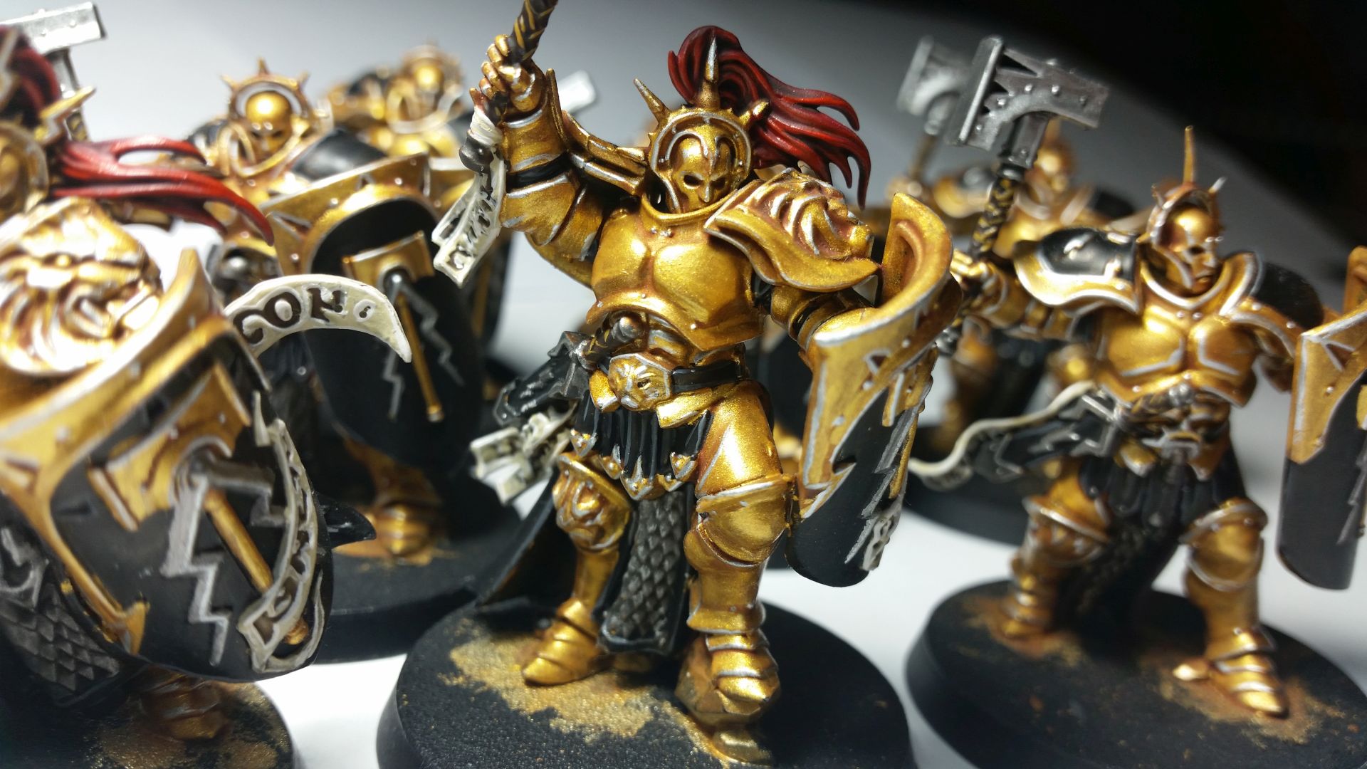 Hat ne Weile gedauert, bis ich ein Farbschema gefunden hab, das mir gefällt. Ich wollte eins bei dem sie keine farbigen Rüstungen tragen, ich wollte schwarz, aber nicht ganz schwarz und dann hab ich mich noch in das goldene bling bling verliebt. :D Bisschen Herumprobieren hat dann gezeigt, dass es besser ist, tatsächlich nur die Schulterpanzer und Schilde schwarz zu bemalen und dann , dann konnte ich mir den battle tome anschauen und hab gesehen, dass die Fists of Sigmarite nicht nur genau dem entsprechen was ich mir für mein stormhost überlegt hatte, sondern dass es quasi das gleiche Farbschema ist (nur mit verschiedenen Farben für Griffwicklungen und den Wappenrock). Ich bin auch noch echt glücklich damit. :-) Aber das zu bemalen war nerviger als gedacht (ist ja nur Rüstung - pfffffffffffff *rollt die Augen*). Immerhin gibt's tatsächlich Reflektionen (zumindest wenn man sie so in's Licht hält wie auf dem Bild :D ).