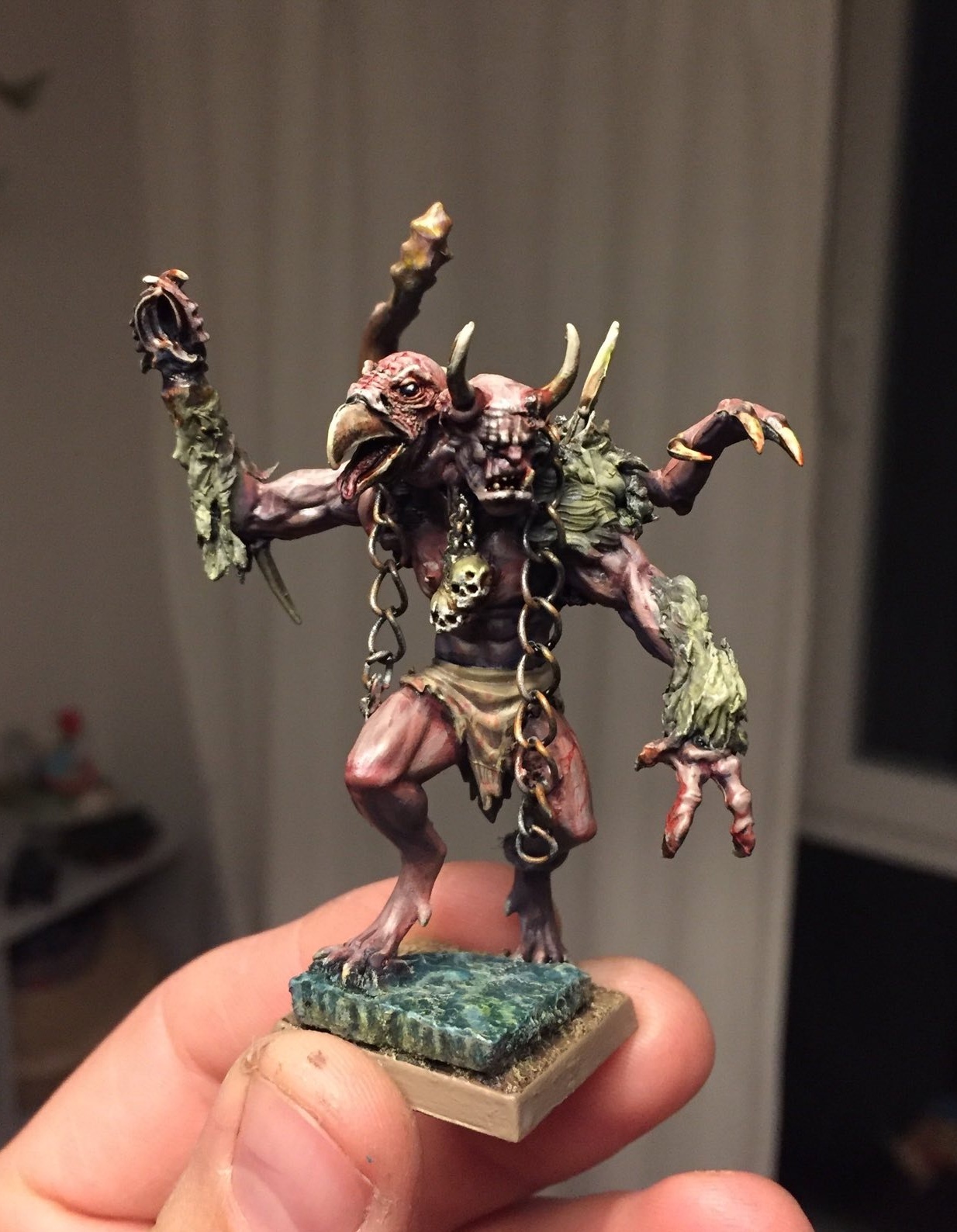 Hmm, gute Frage :), Ungefähr so: Bugmanns Glow und Heavy Red von Valejo und ein dunkles Magenta auf die Nasspalette und dann alles was im Schatten liegt.. (Arme von unten, Hals und co.) mit mehr Magenta drin grundiert und alles dem Licht zugewandte mit mehr "warmem" Bugmanns Glow, bei der Grundierung. Alles feucht ein bisschen mit "Wetblending" zusammengeführt. Dann die Bugmanns-Flächen langsam Richtung helles Grau mit Glazes geschadet und die Magenta-Flächen nur leicht Richtung Rakarth Flesh.. Alles was weiter unten liegt (Ab dem Torso) kriegt weniger helle Highlights. Die hellsten Highlights kommen nur am Kopf und auf den Armen.. Ungefähr so.. :) !