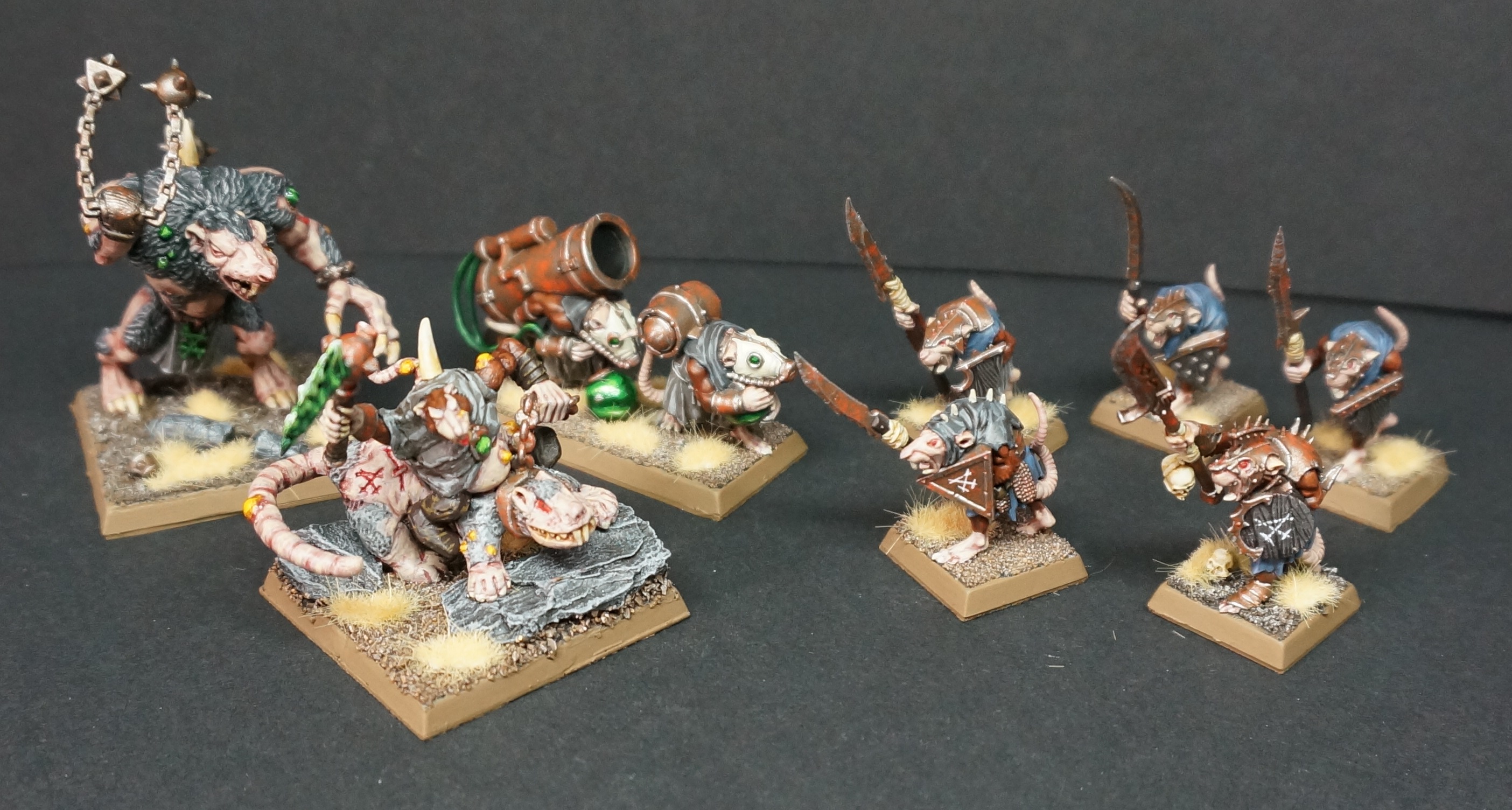 Nach teilweise mehreren Jahren im halbfertigen Zustand sind auch diese Nager nun endlich fertig:- Pestbauch und Grinser (Seuchenpriester auf Pockenratte)- 1 ROger- 1 Giftwindmörser- 1 Klanrattenchampion- 4 Speerratten (Klanratten mit Speeren)